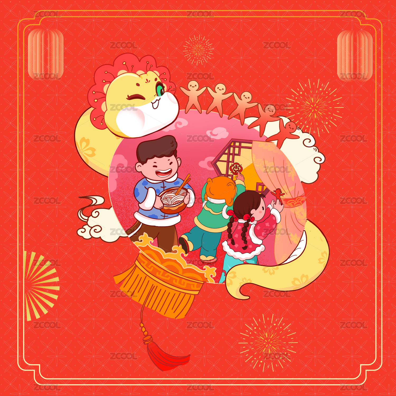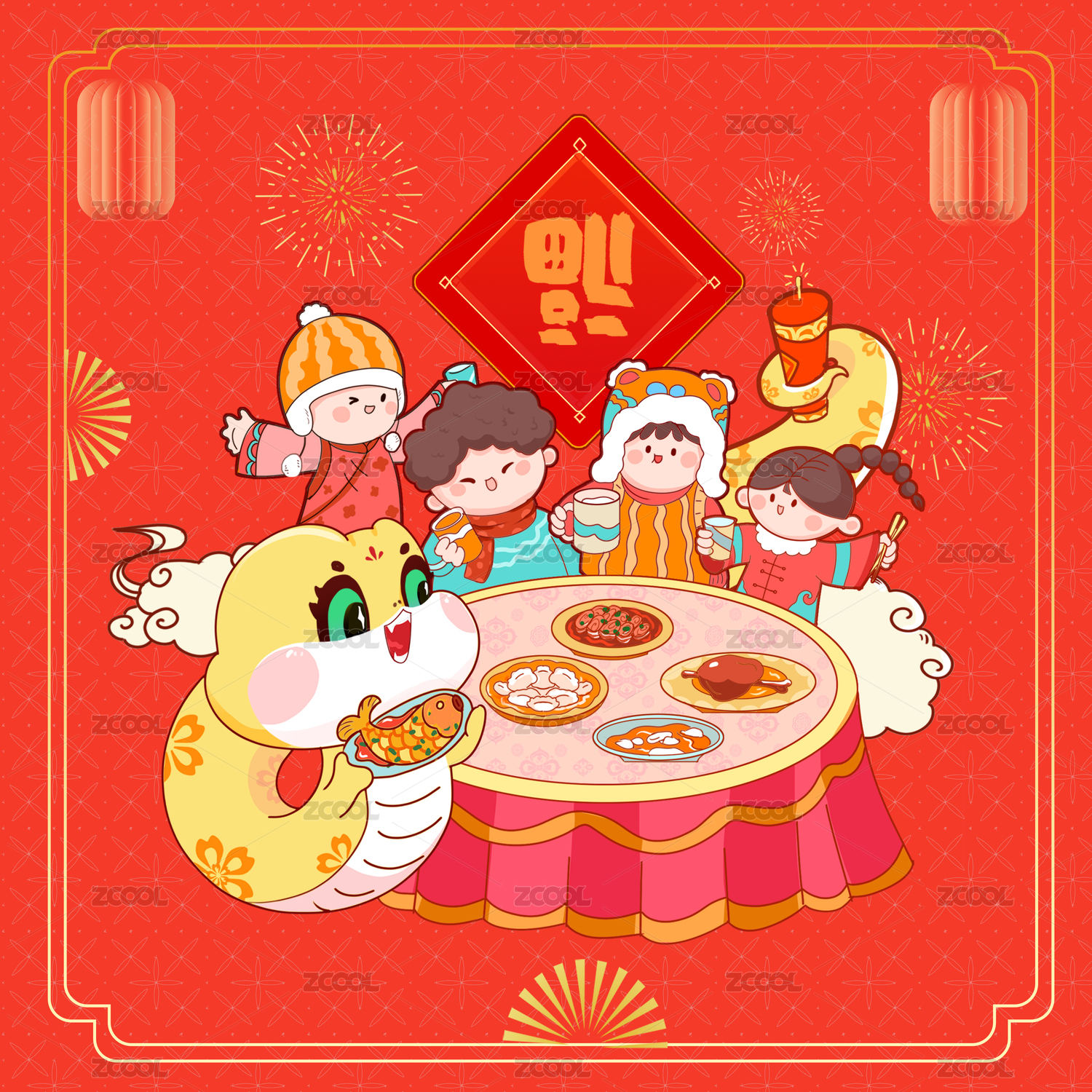 蛇年新春春節(jié)除夕團(tuán)圓日年俗系列插畫