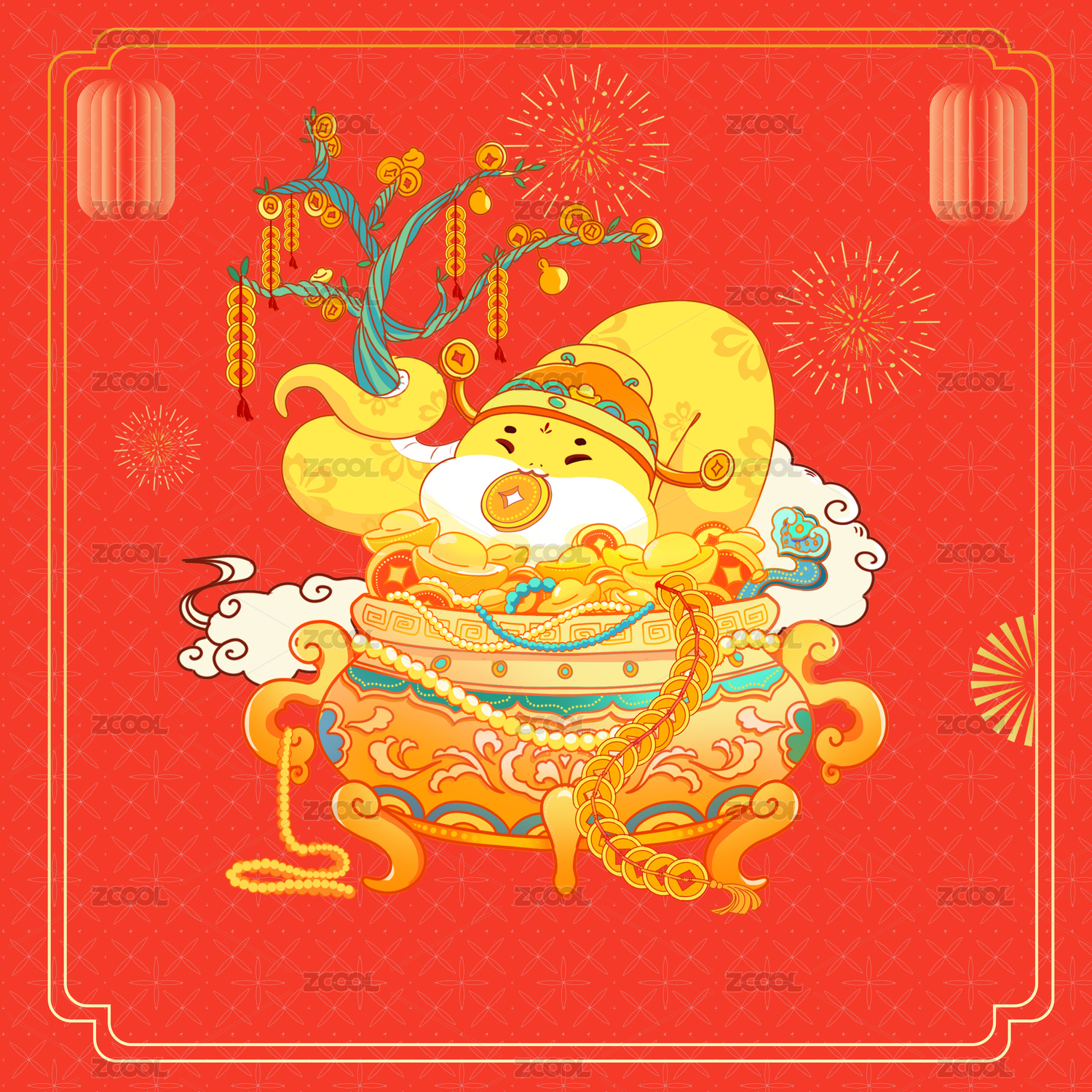 蛇年新春春節(jié)大年初五迎財(cái)神年俗系列插畫