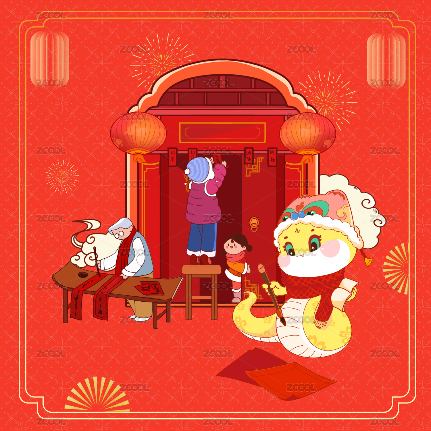 蛇年新春春節(jié)年俗大年初一拜大年系列插畫