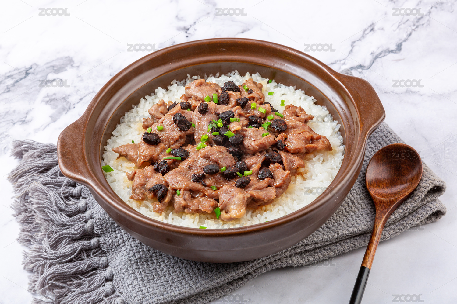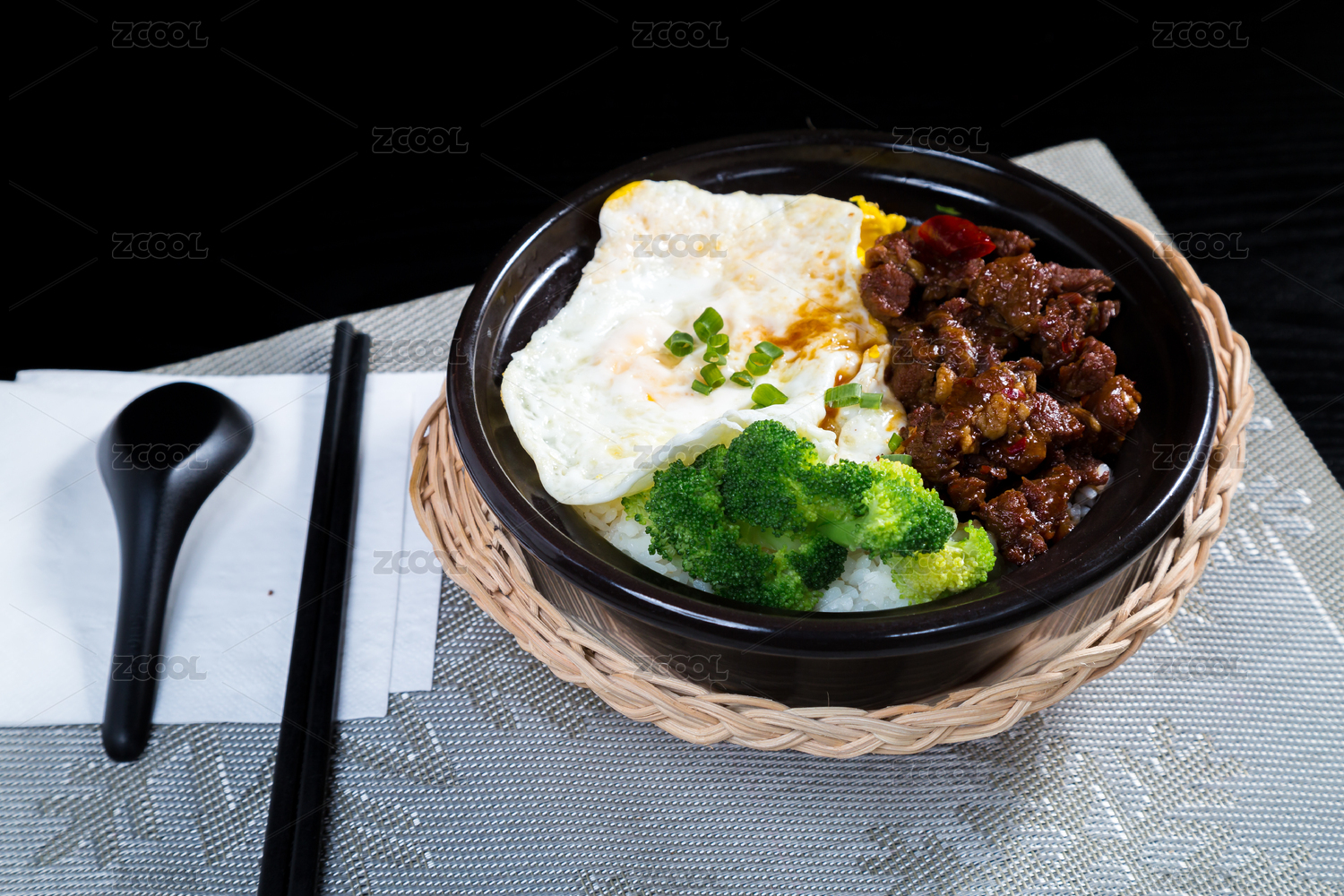 棕色木紋桌上放著一碗牛肉煲仔飯