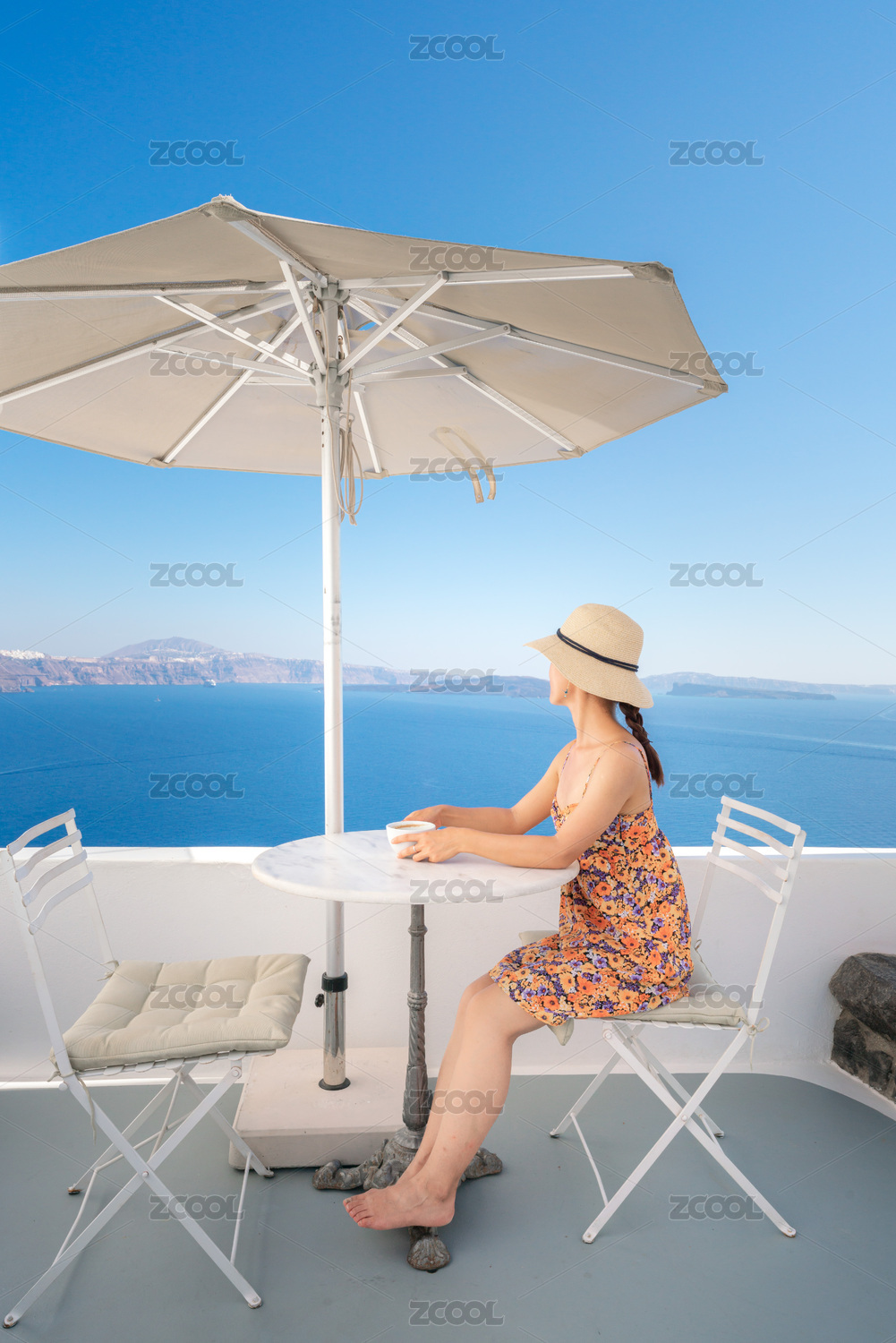 一名亞洲女性坐在海島的戶外露臺(tái)上喝咖啡