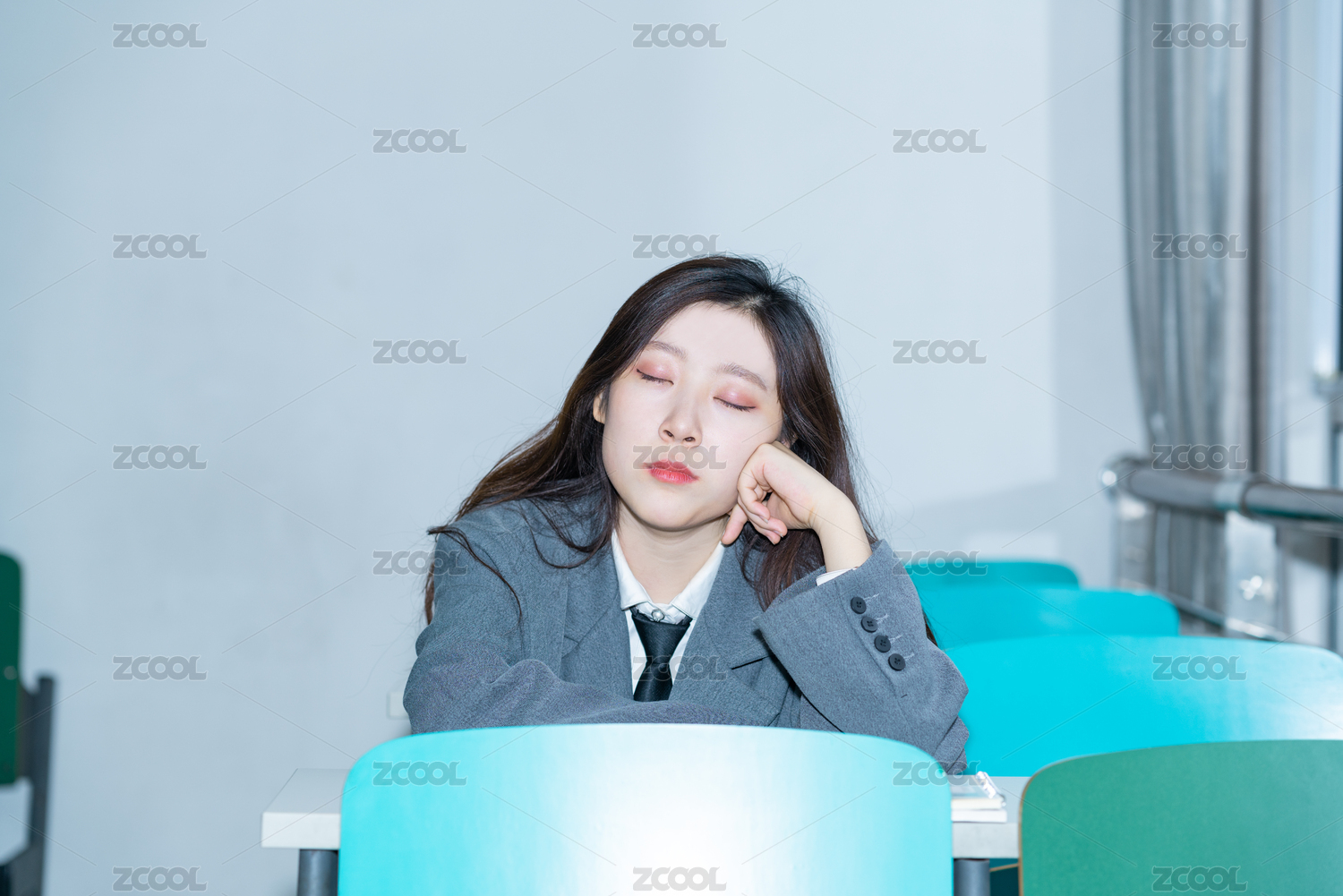 美女大學(xué)生上課教室內(nèi)坐在椅子上心不在焉走神犯困疲倦匹配發(fā)呆愣神注意力不集中