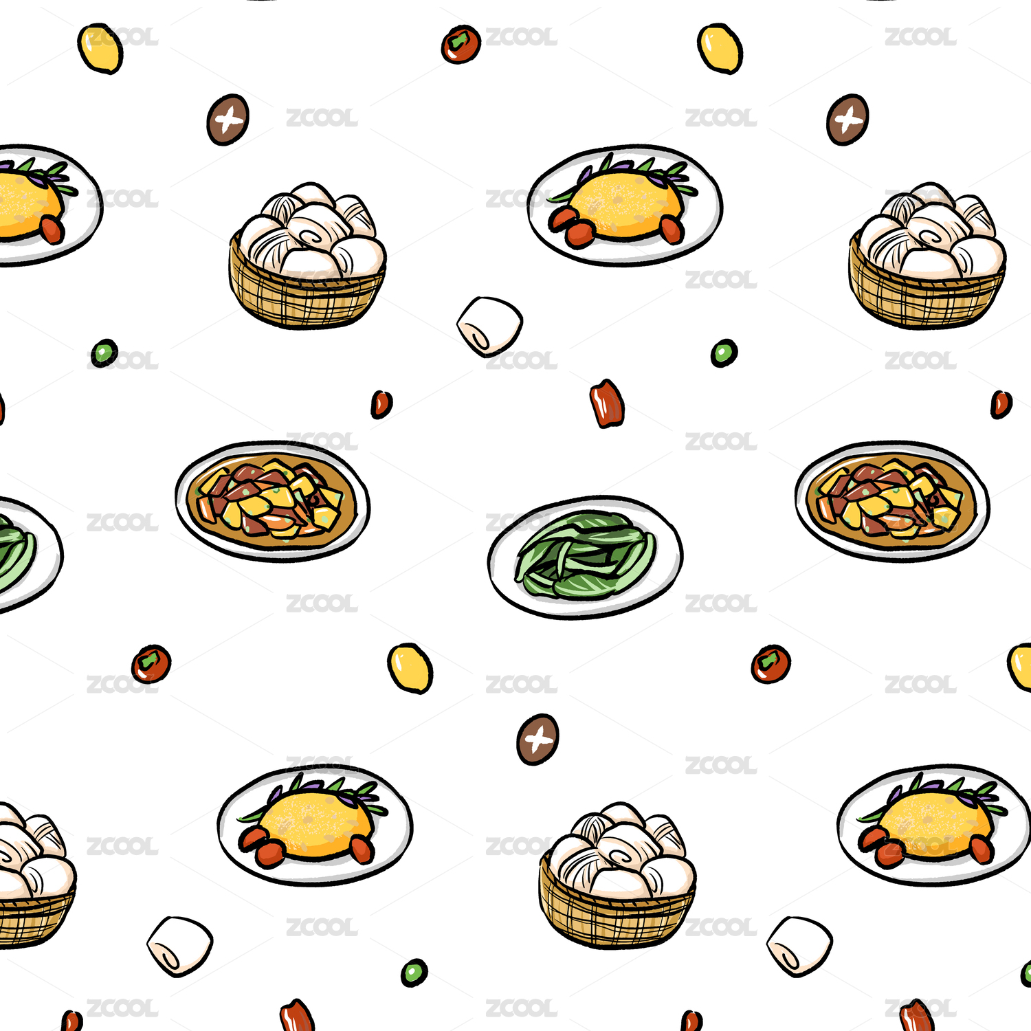中式炒菜大盤雞和饅頭花卷 矢量無(wú)縫圖案