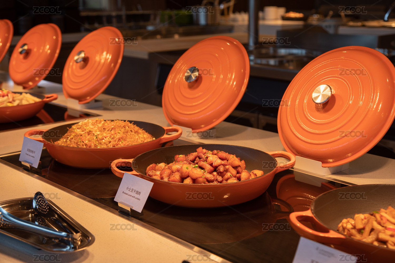 自助餐廳的餐臺(tái)上擺放豐富多種的中式炒菜