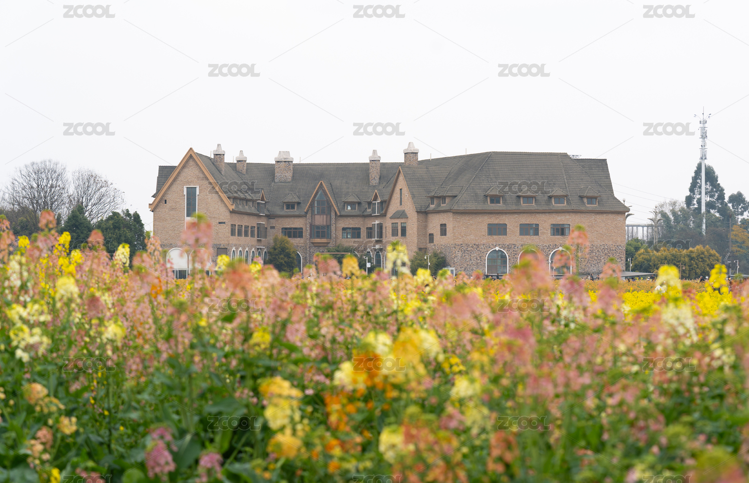 天府農(nóng)博園的油菜花田和歐式建筑