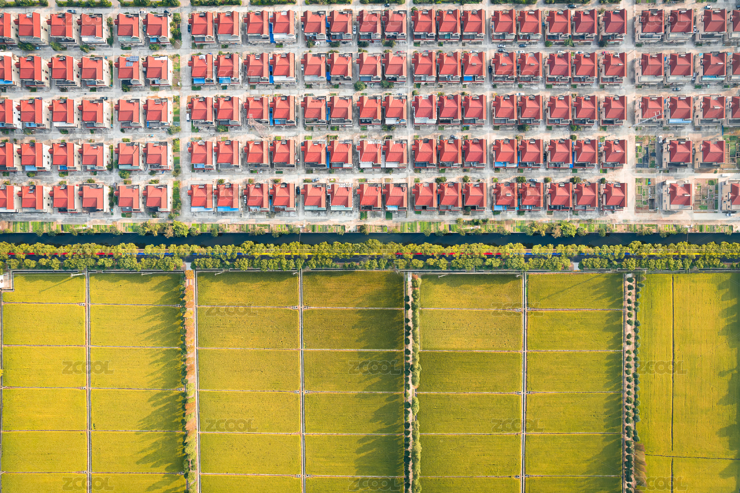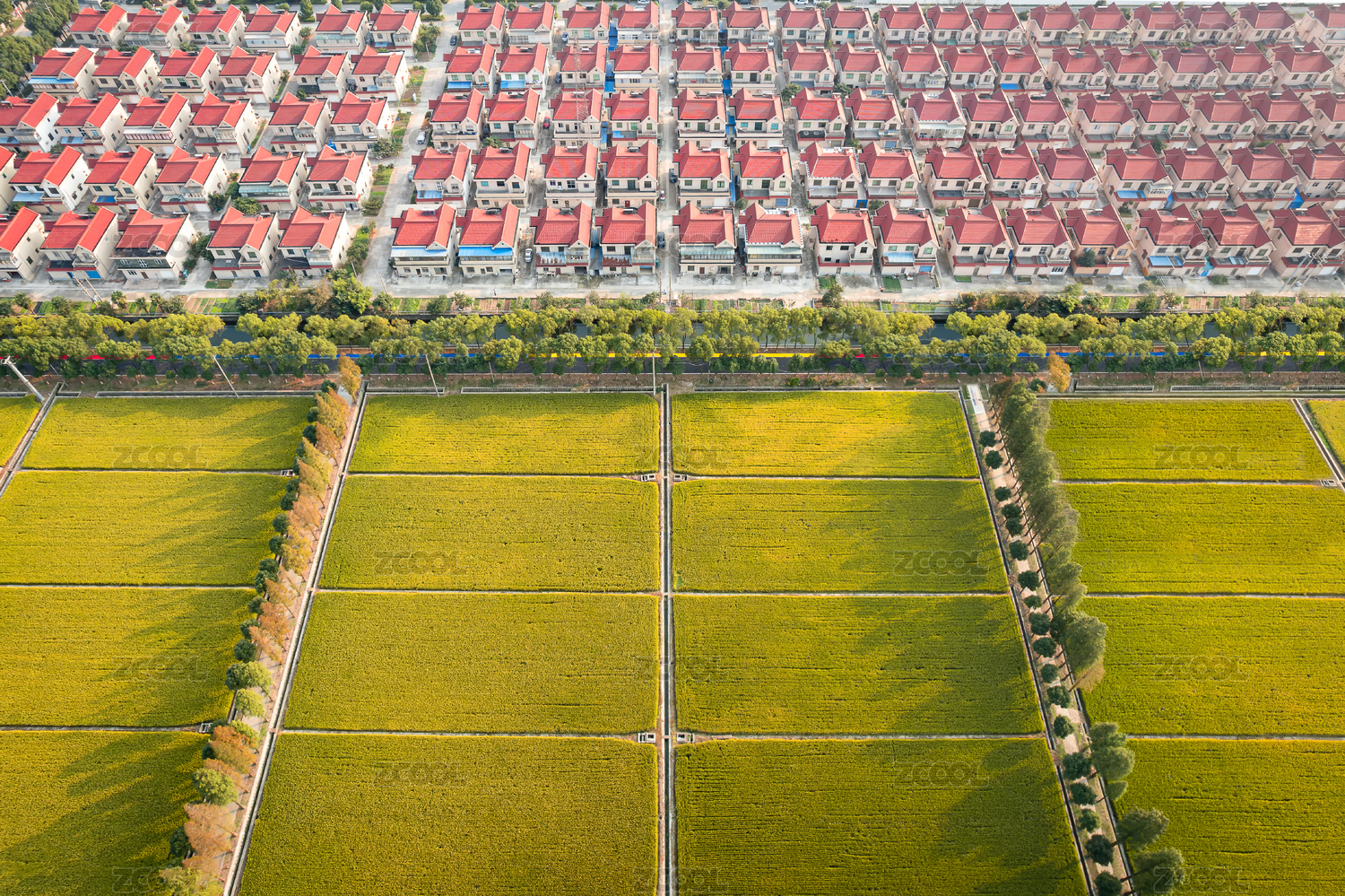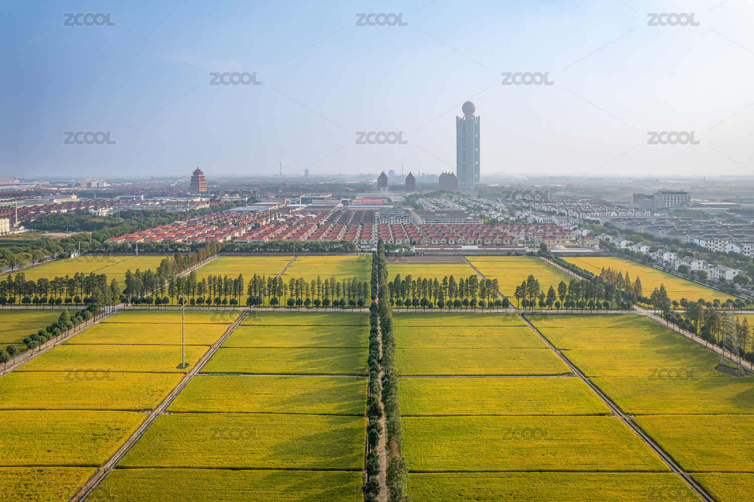 航拍視角下的江陰向陽村稻田和別墅群