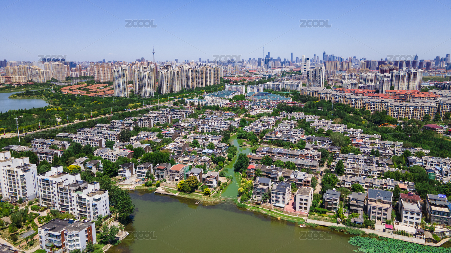 中國天津梅江風(fēng)景區(qū)湖景別墅群航拍圖