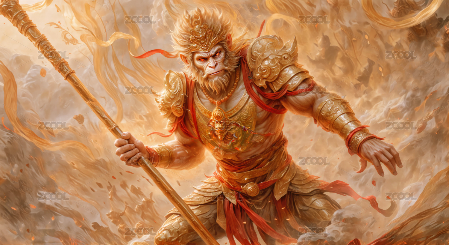 齊天大圣孫悟空手持金箍棒騰云駕霧在花果山