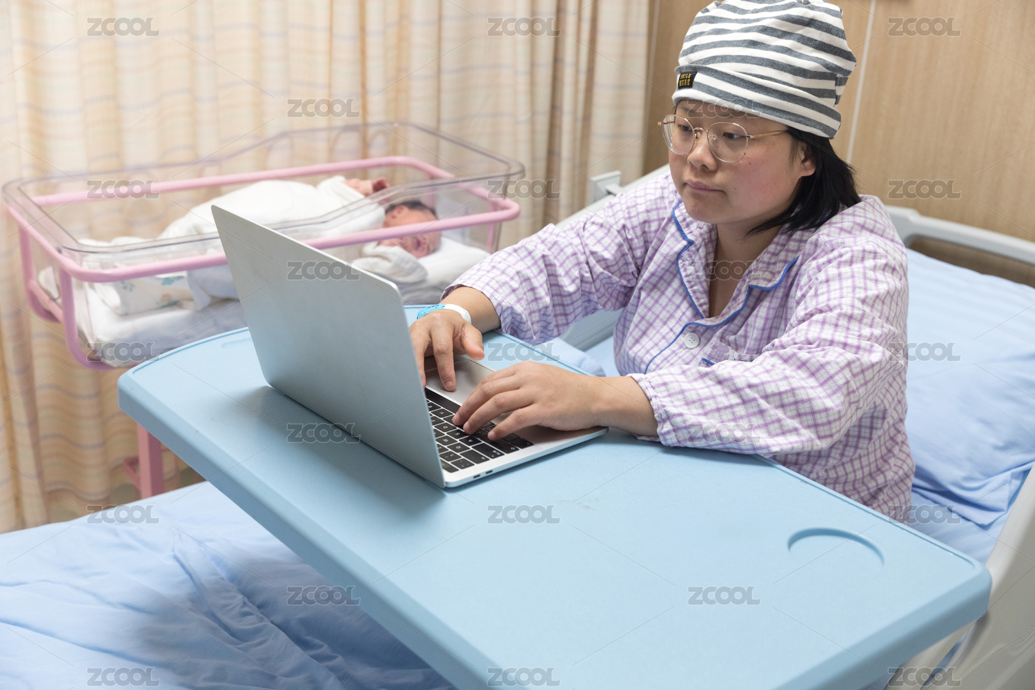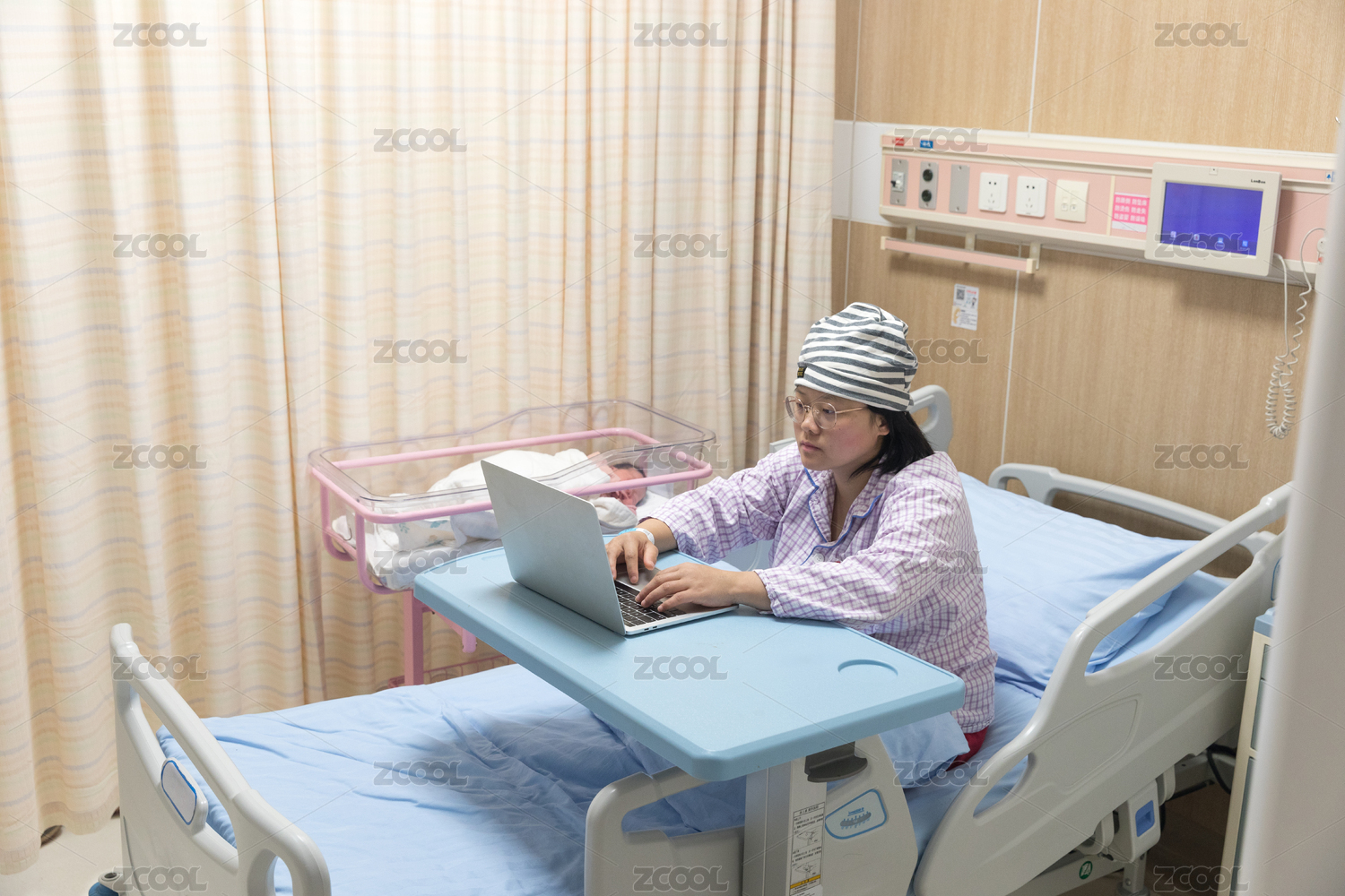 病房中的孕婦坐在床上使用筆記本電腦辦公