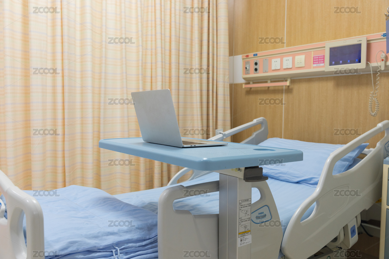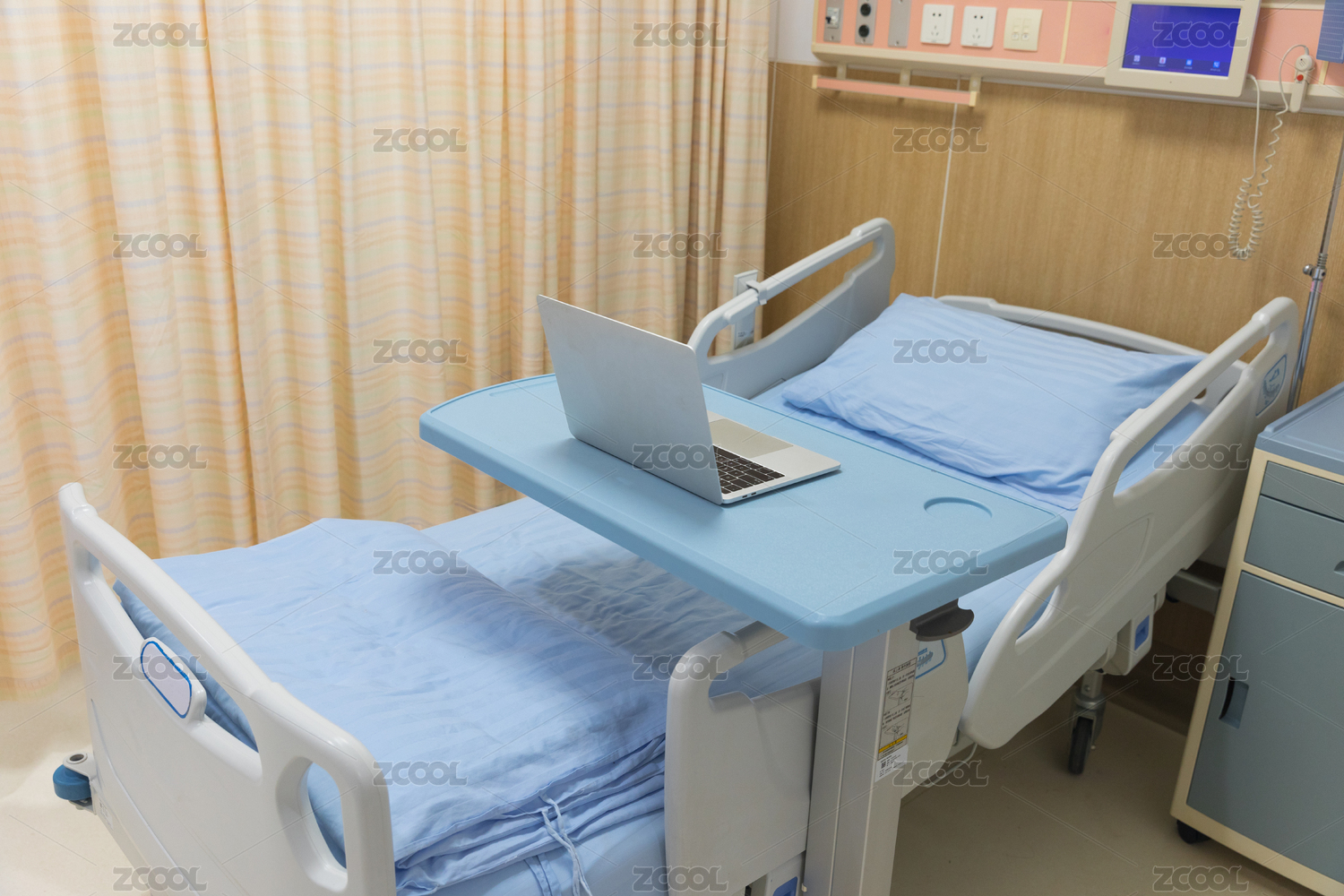 醫(yī)院病房中放在小桌板上的筆記本電腦