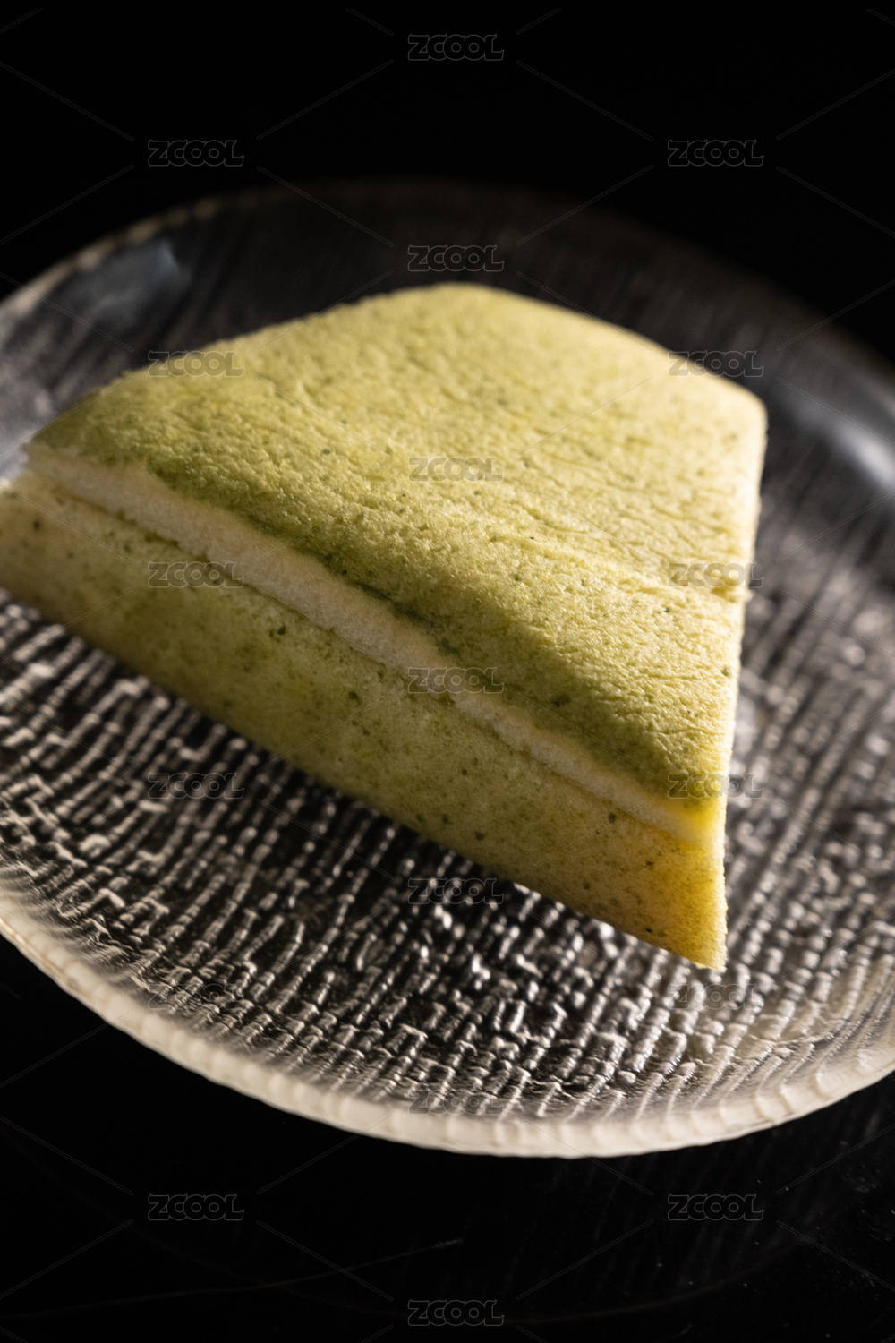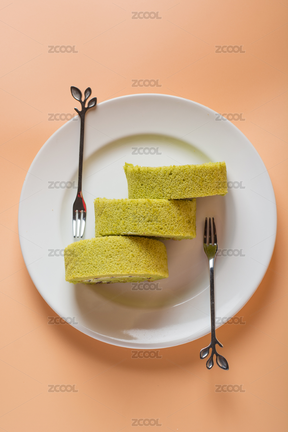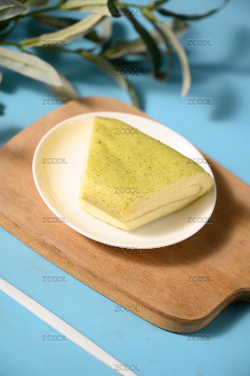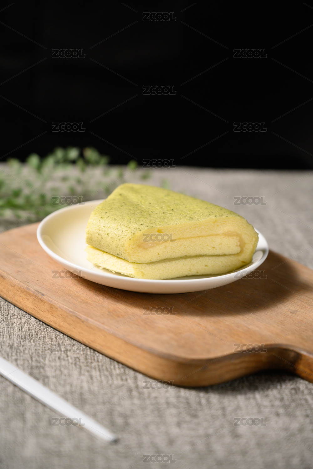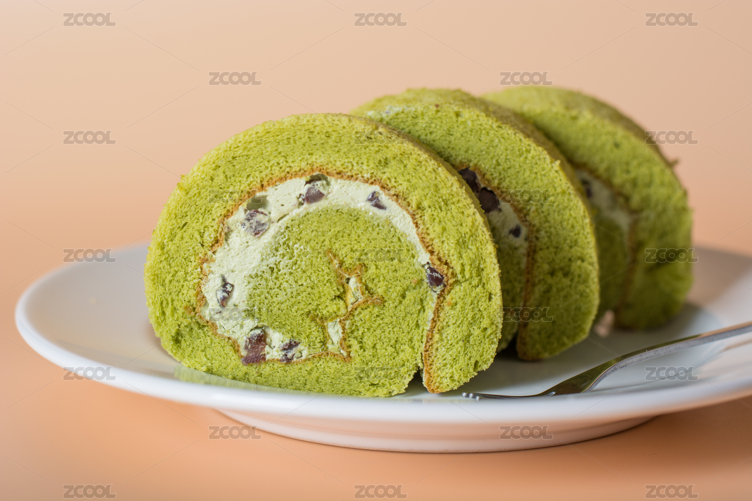 桌面上的盤子里的美味可口的抹茶蛋糕卷