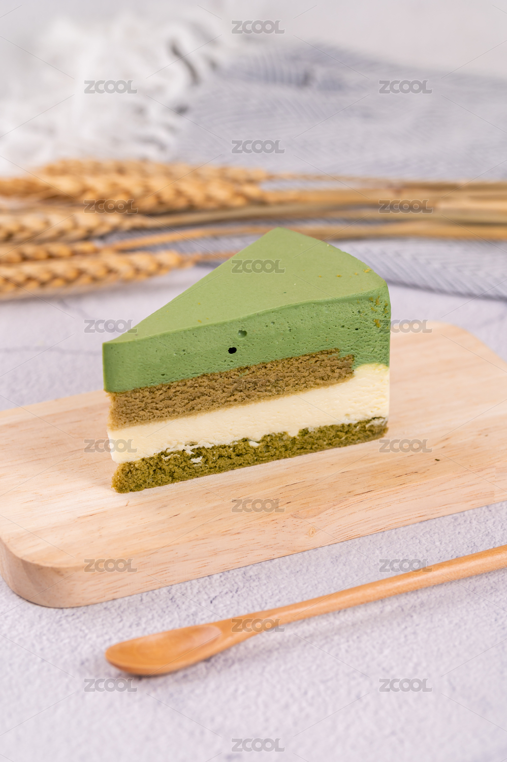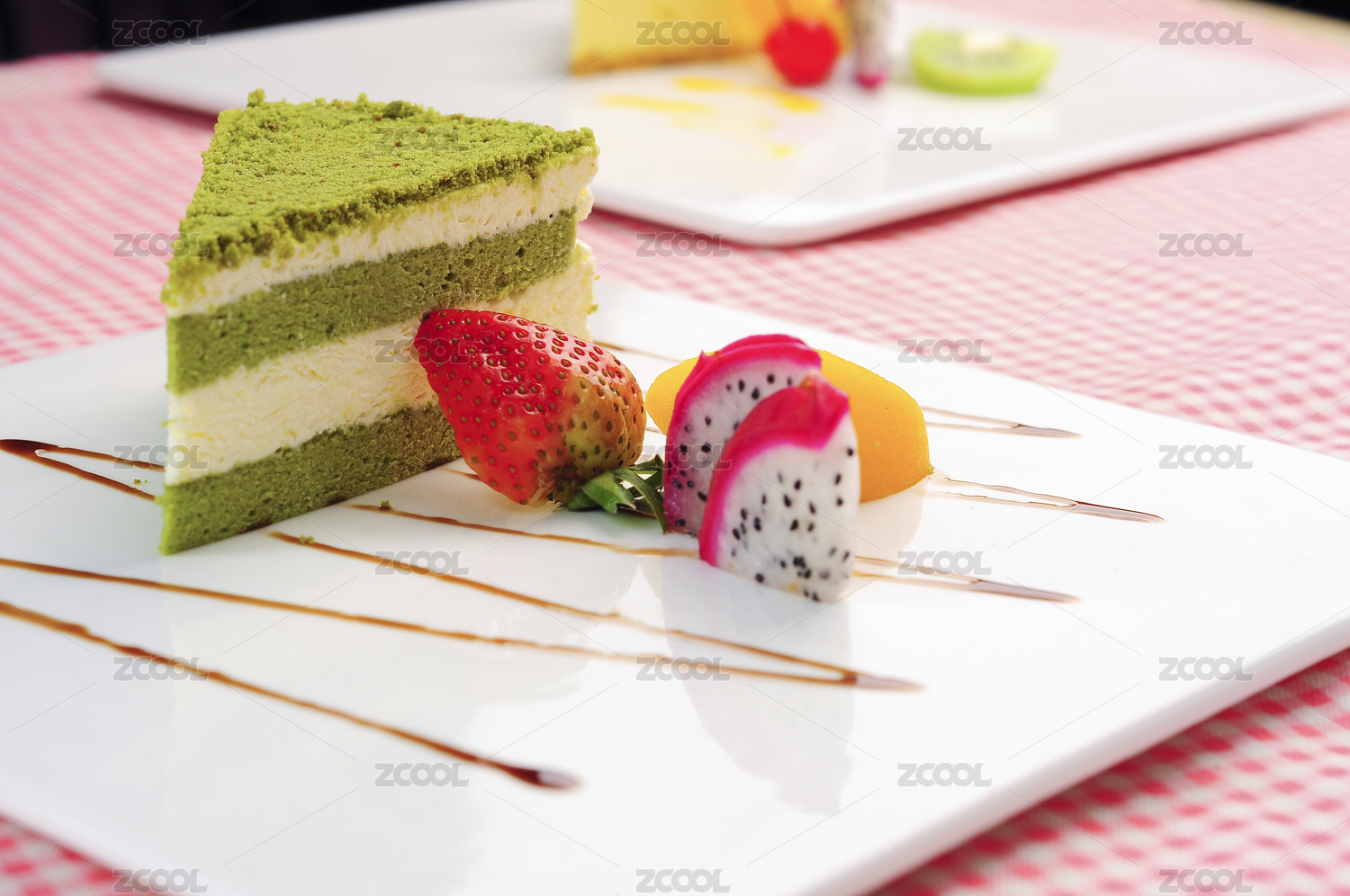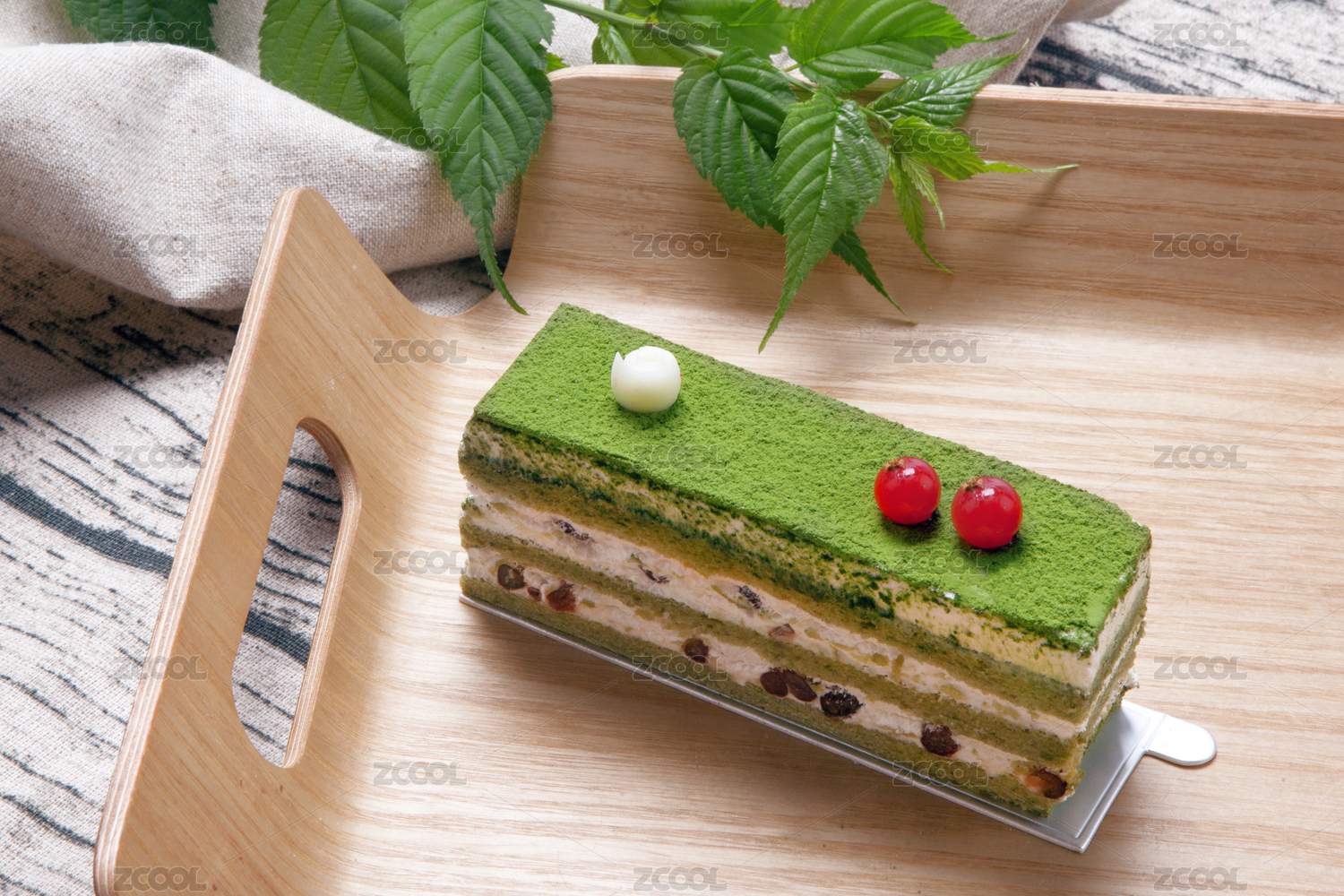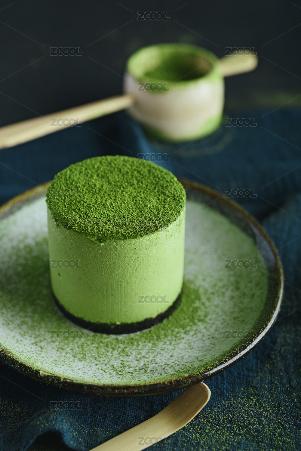 桌面上的盤子里的美味可口的抹茶蛋糕卷