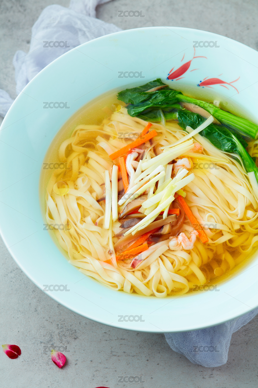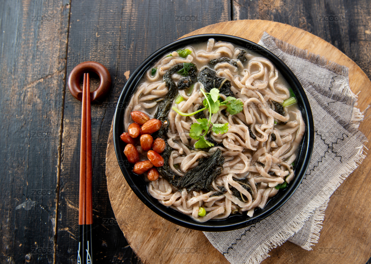 木紋背景上黑碗中擺放的芝麻葉雜面條
