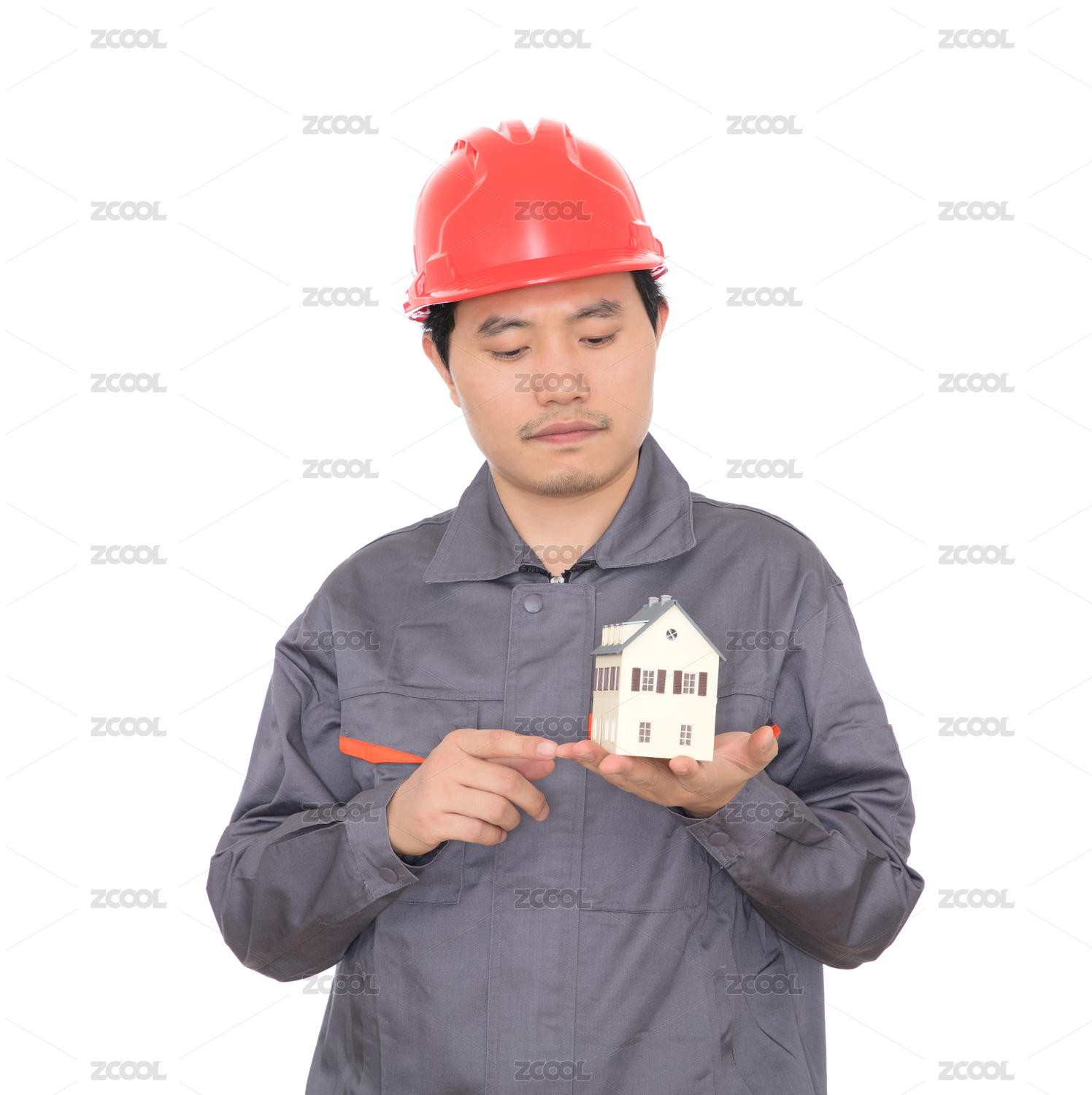 頭戴紅色安全帽的建筑師查看手中的小房子模型