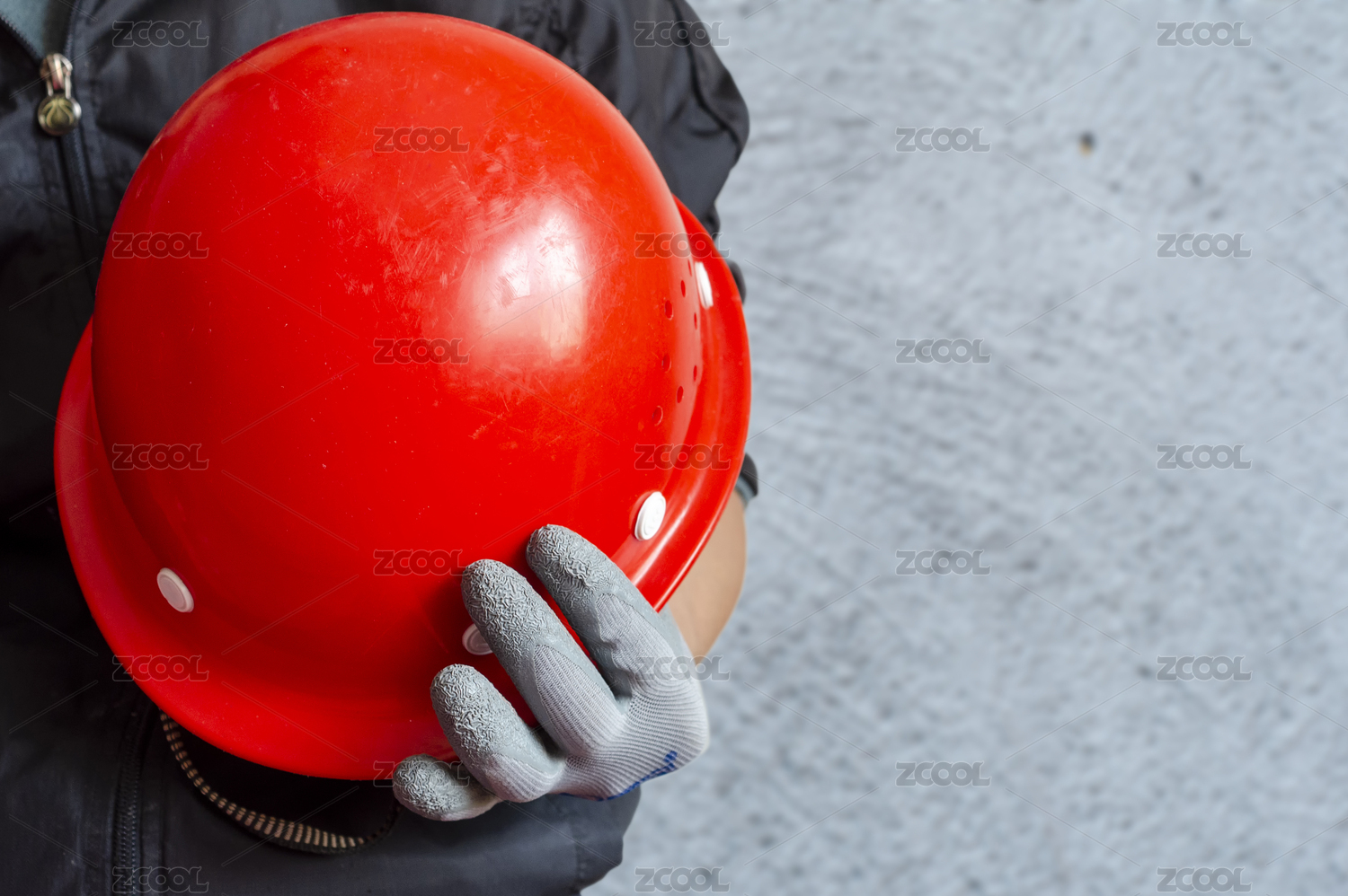 手拿安全帽站在水泥墻前的工人