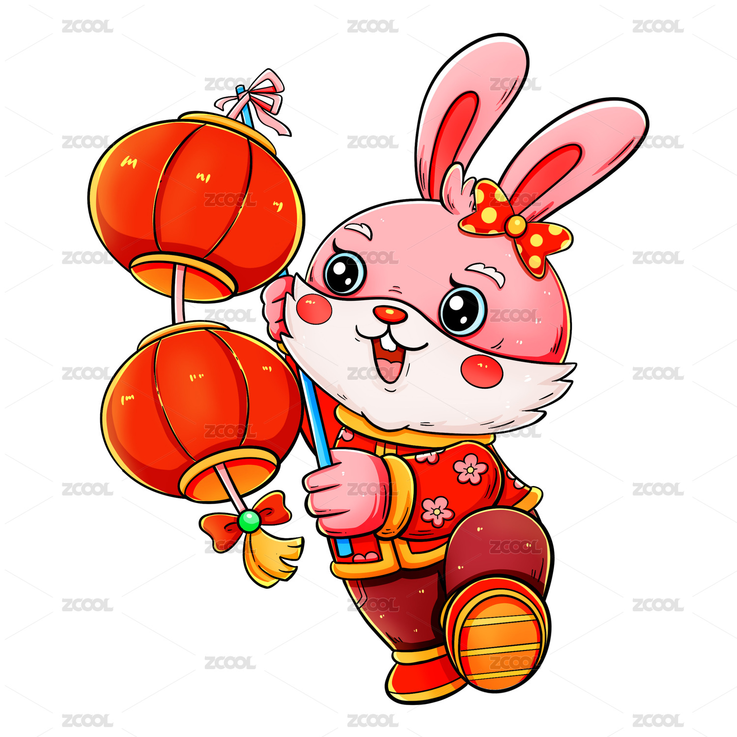 國潮兔年新年提燈籠的粉色兔子插畫