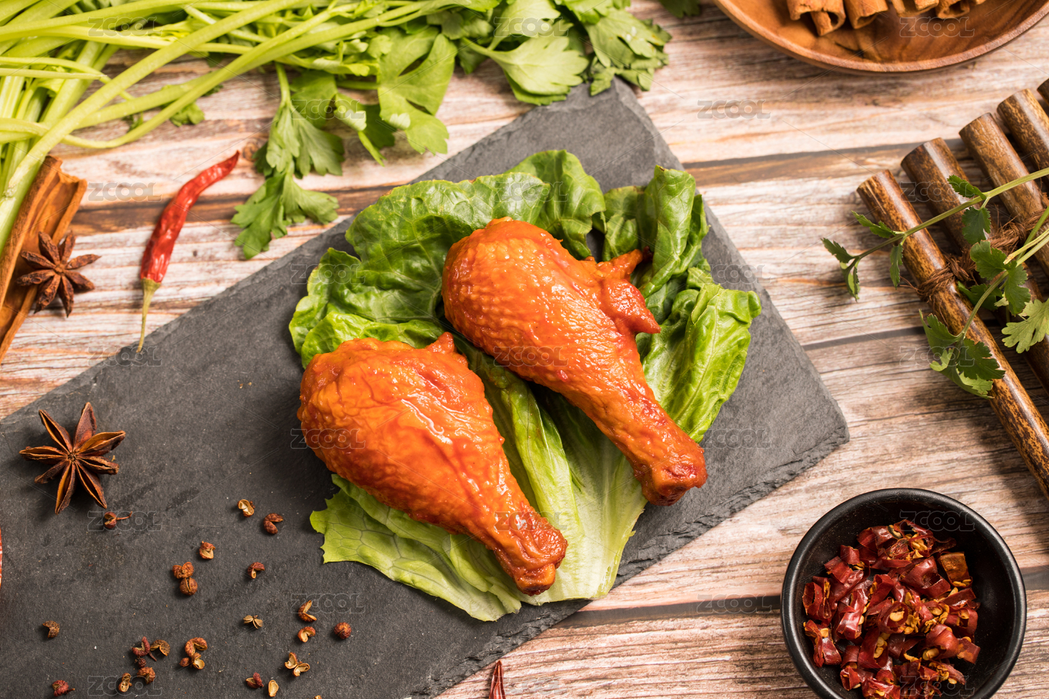 傳統(tǒng)背景下兩個(gè)放在石板上的美味鹵雞腿