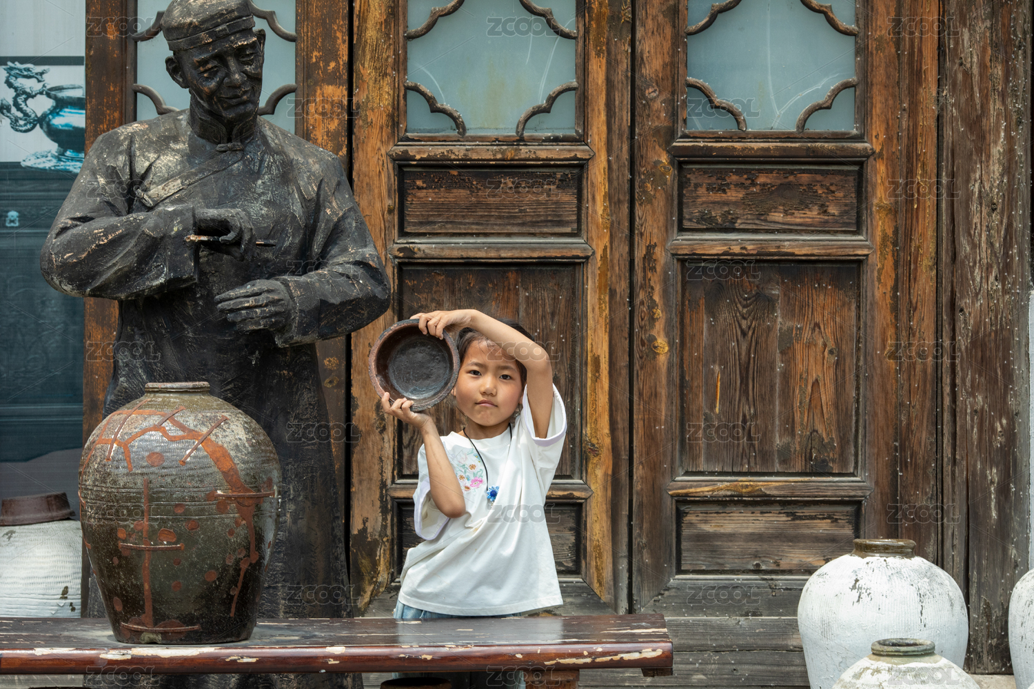父女與雕塑合影,傳統(tǒng)背景酒文化