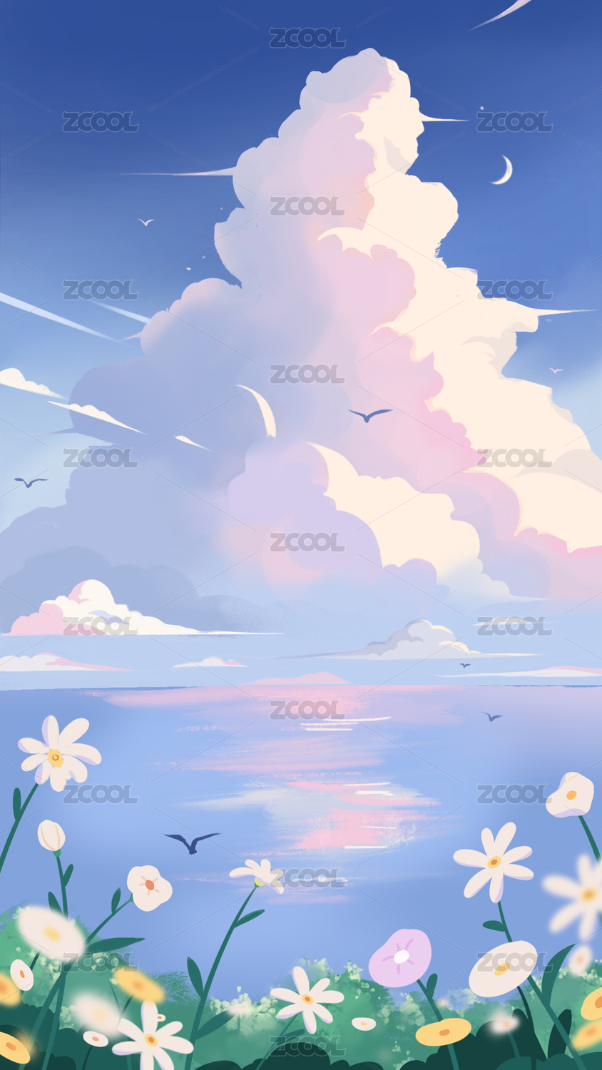 藍(lán)天白云海邊唯美風(fēng)景插畫