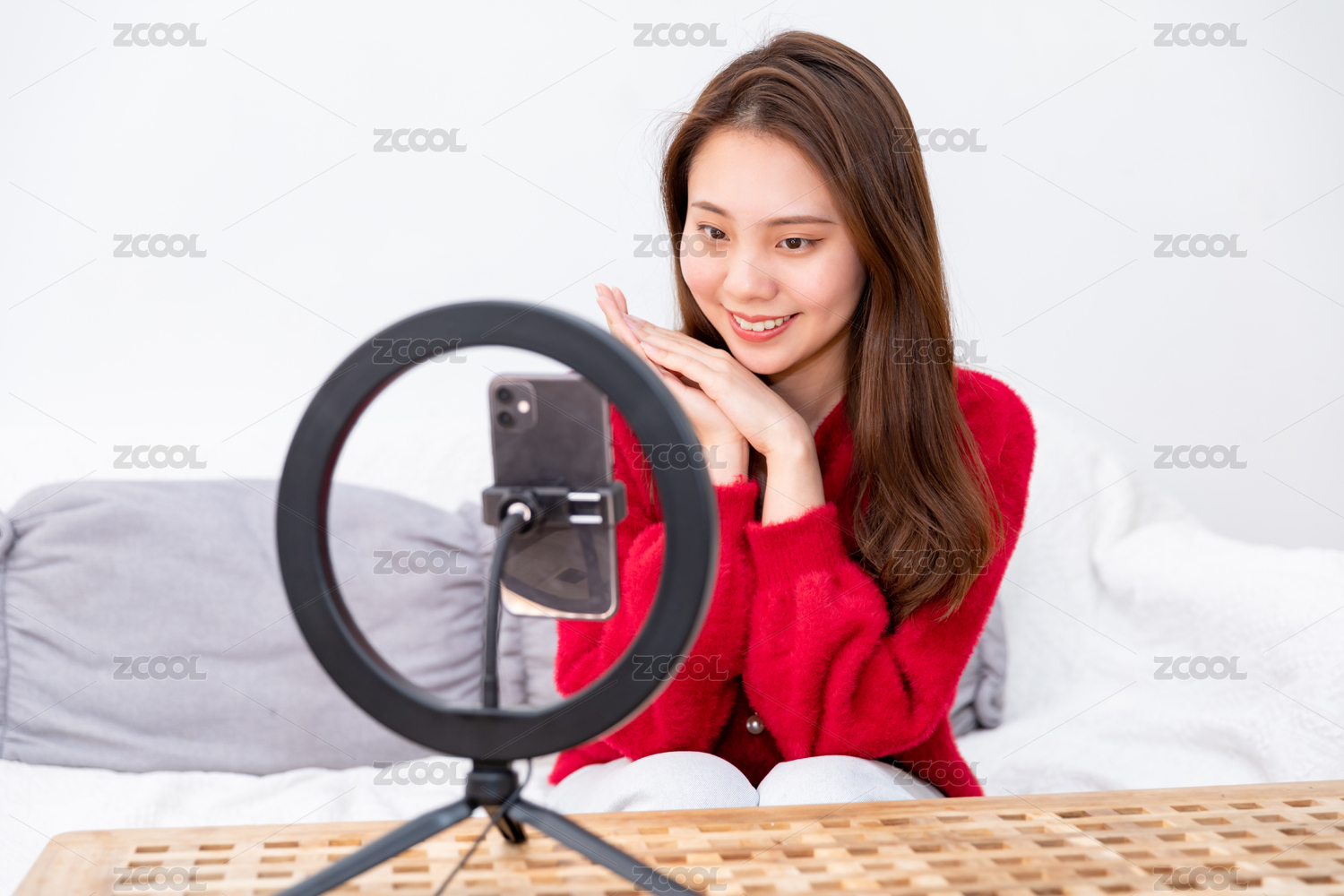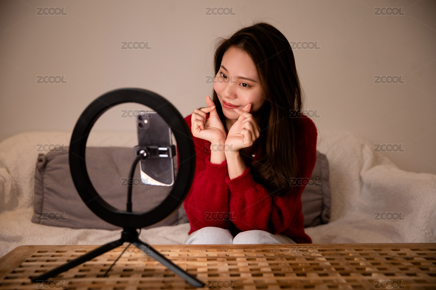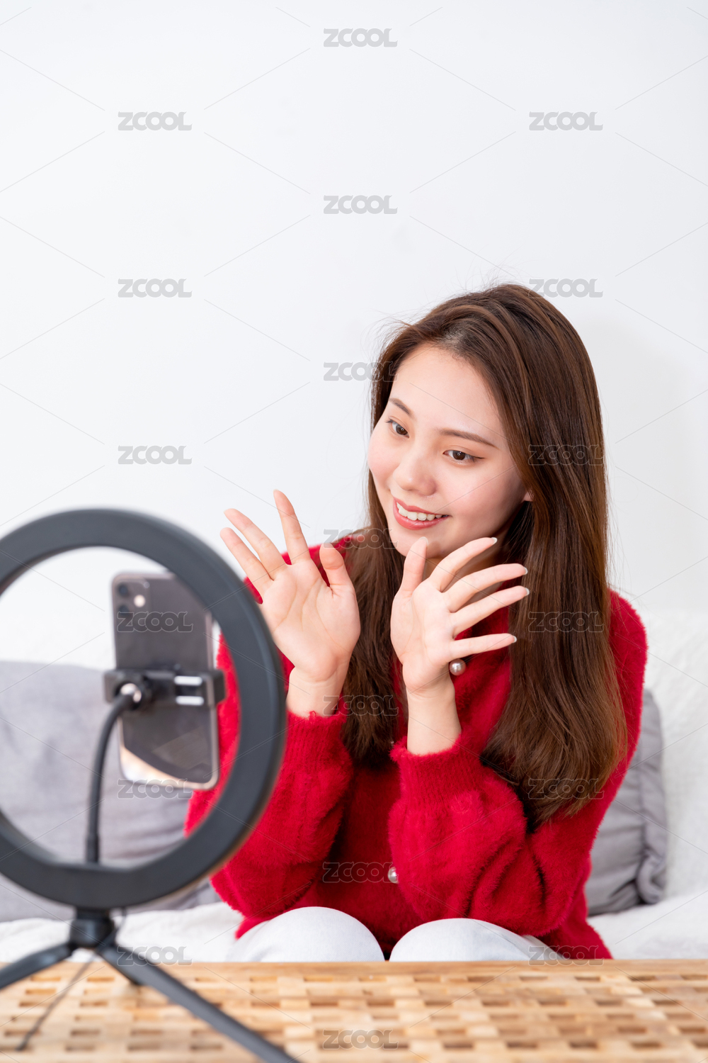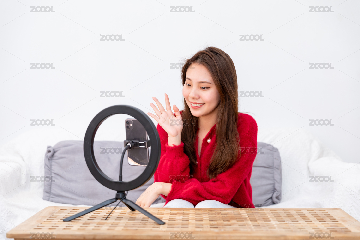 甜美女生坐在沙發(fā)上對(duì)著手機(jī)直播打招呼