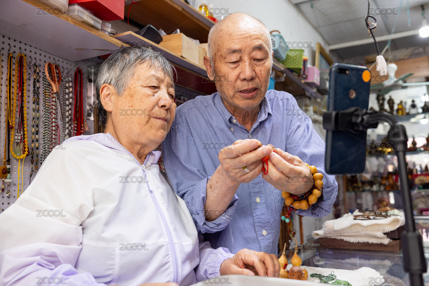 文玩店內(nèi)的老年夫婦使用手機(jī)直播