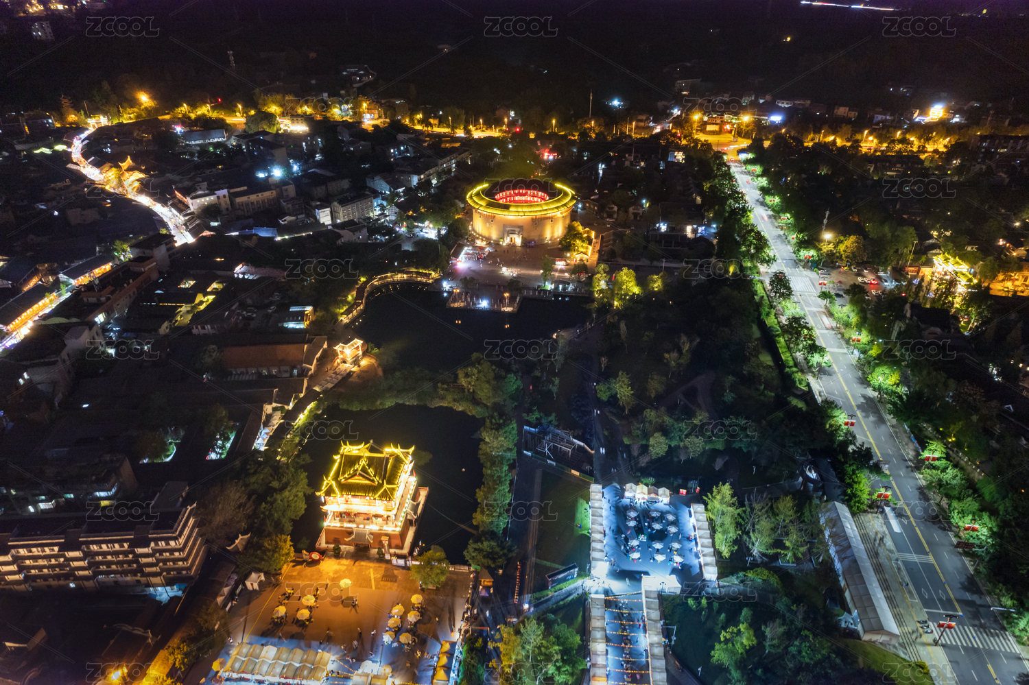 成都龍泉驛洛帶古鎮(zhèn)博客樓和五鳳樓夜景航拍
