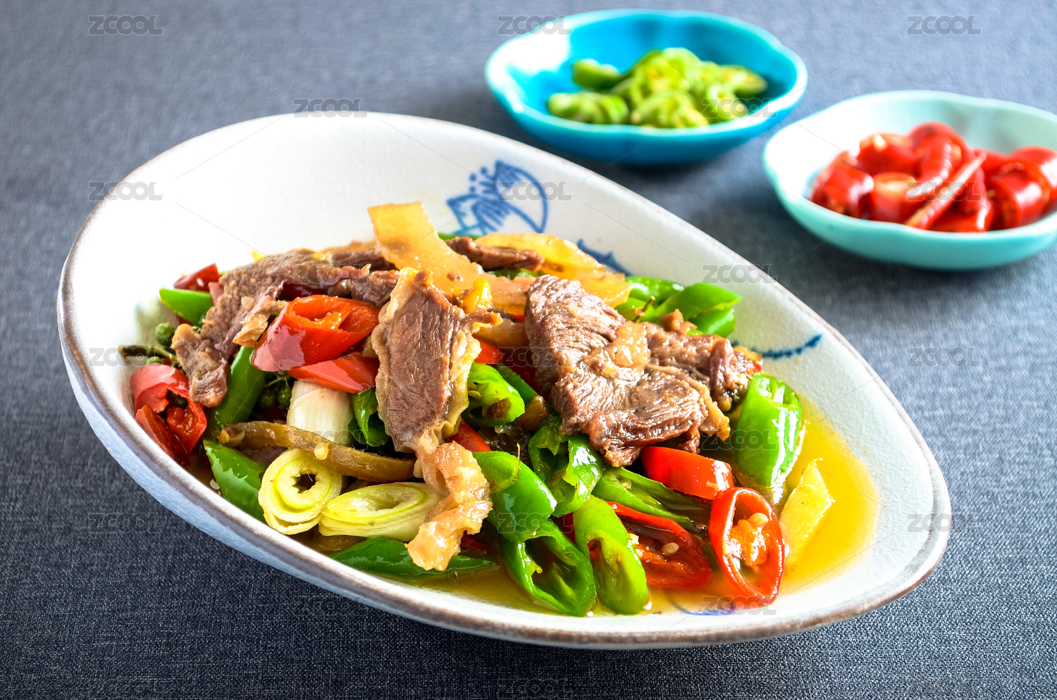 黑色背景家常菜一盤(pán)仔姜炒牛肉
