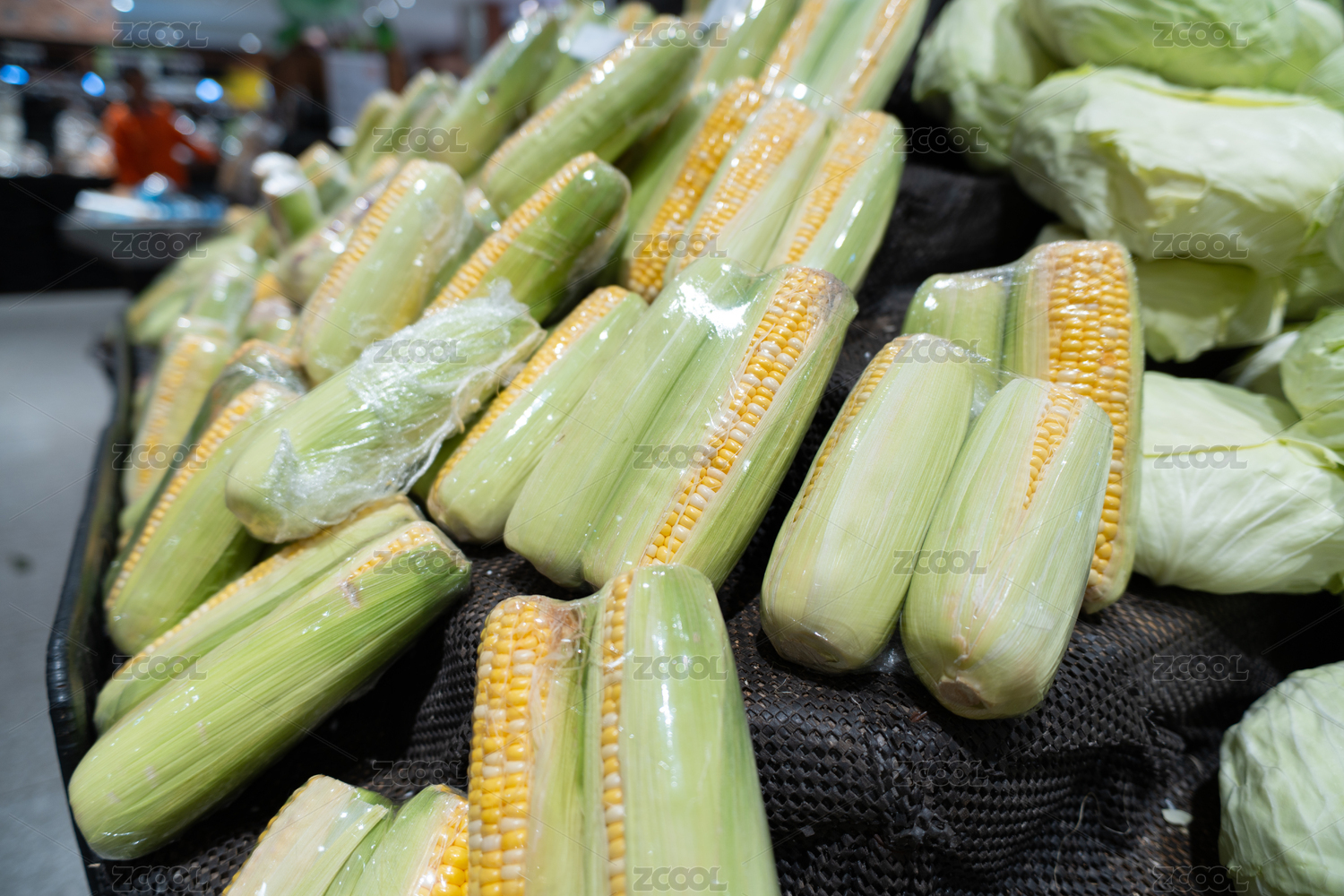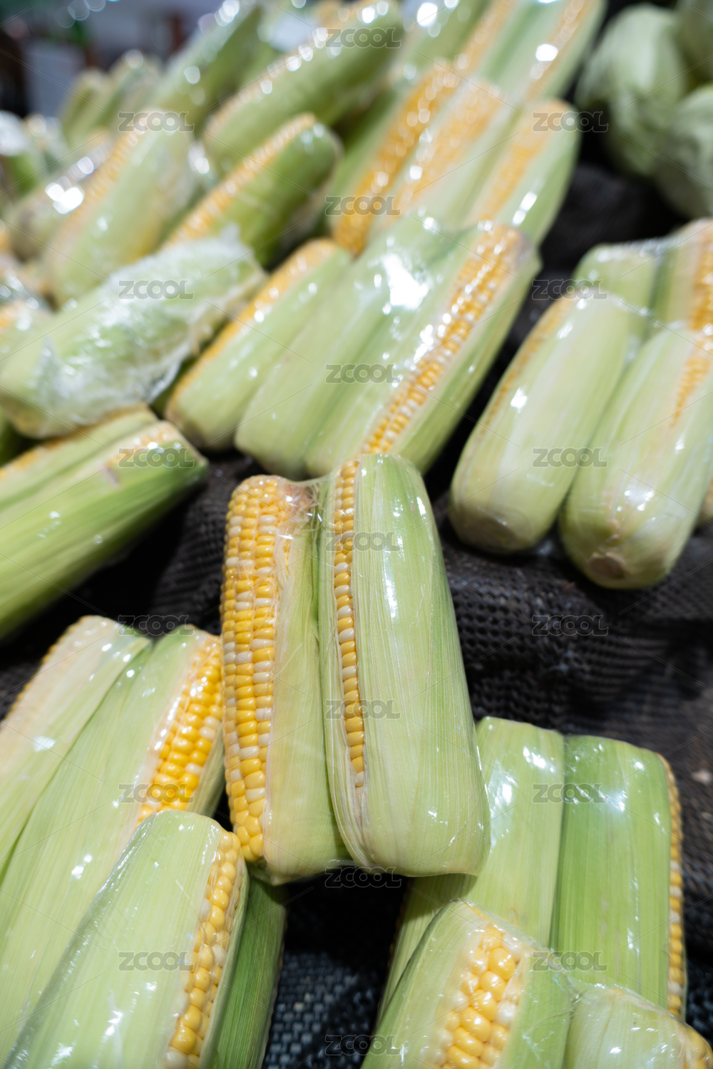 亞洲中國超市的貨架上擺滿保鮮膜包著的玉米