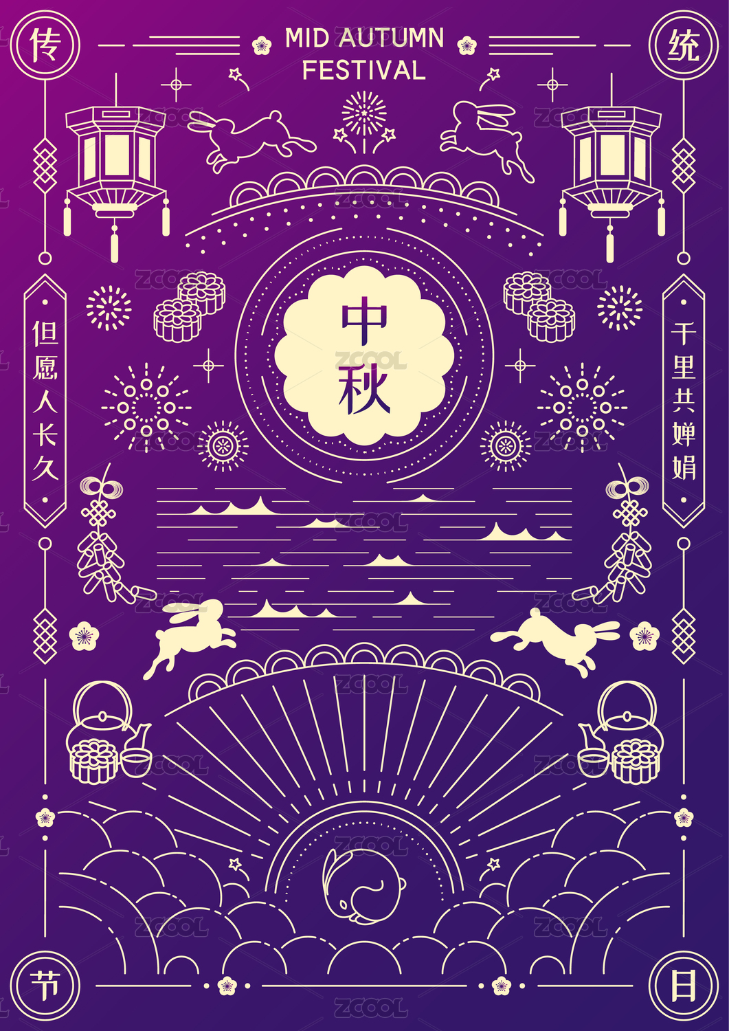 中秋節(jié)漸變玉兔燈籠月餅煙花線性國風(fēng)插畫