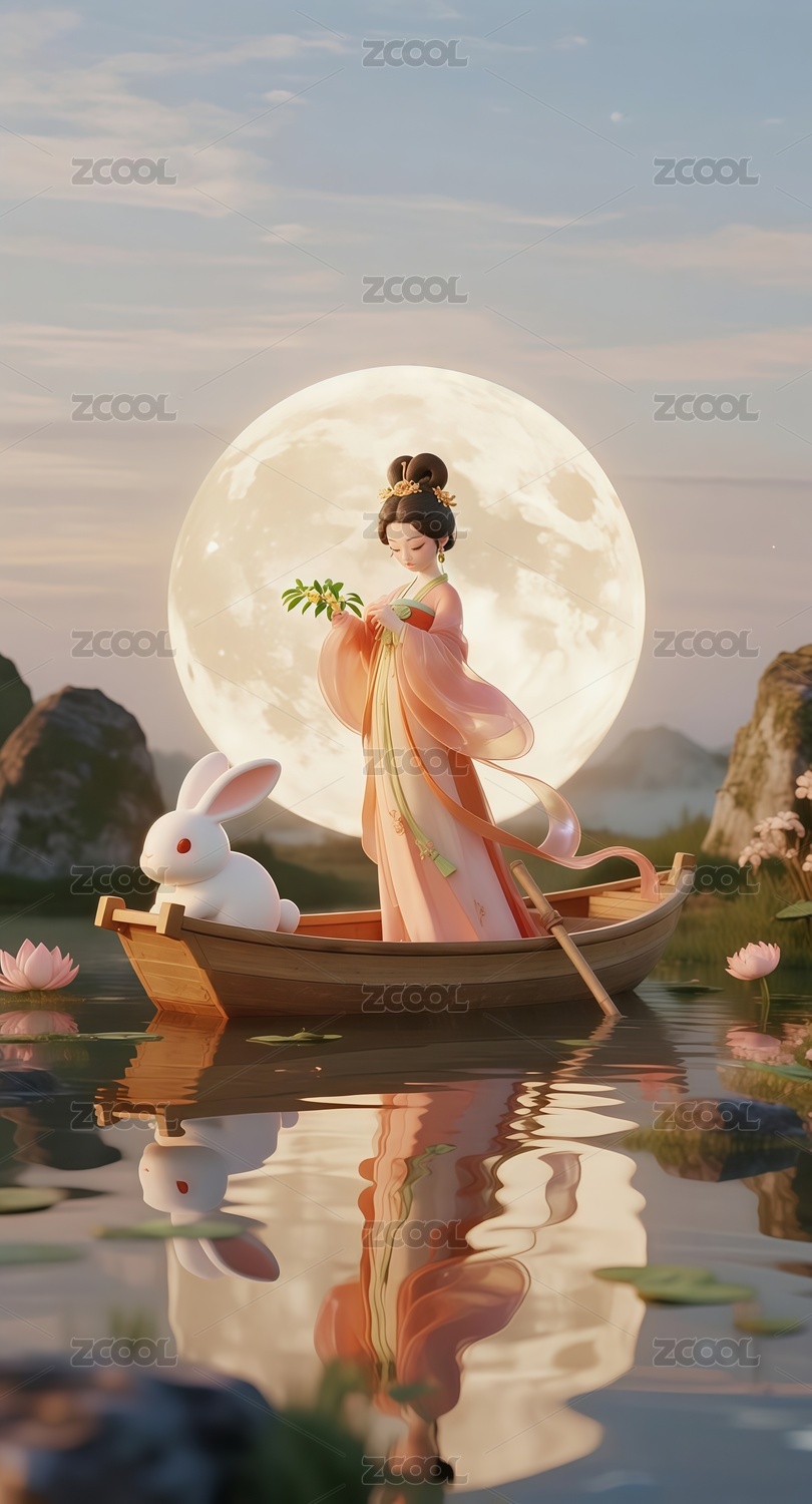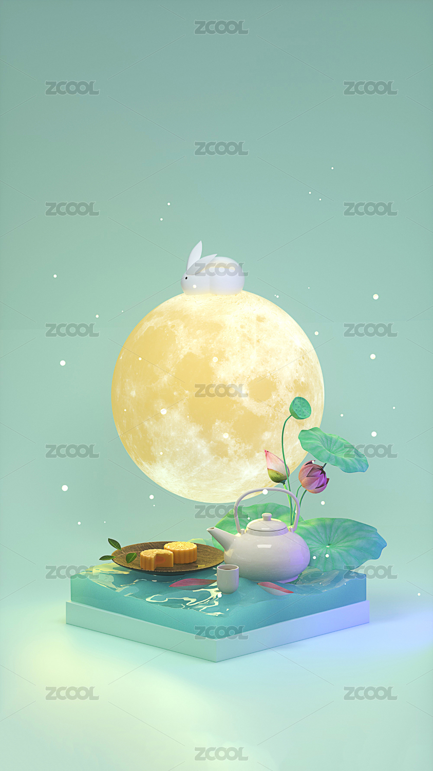 中秋賞月云紋玉兔月餅荷花橫豎版插畫3d