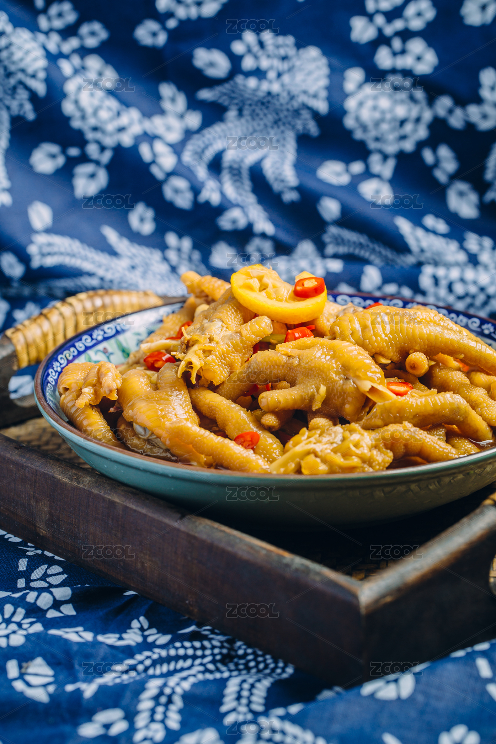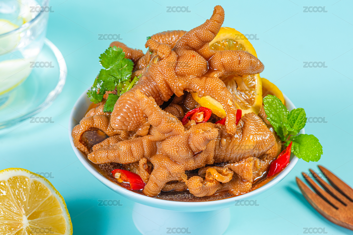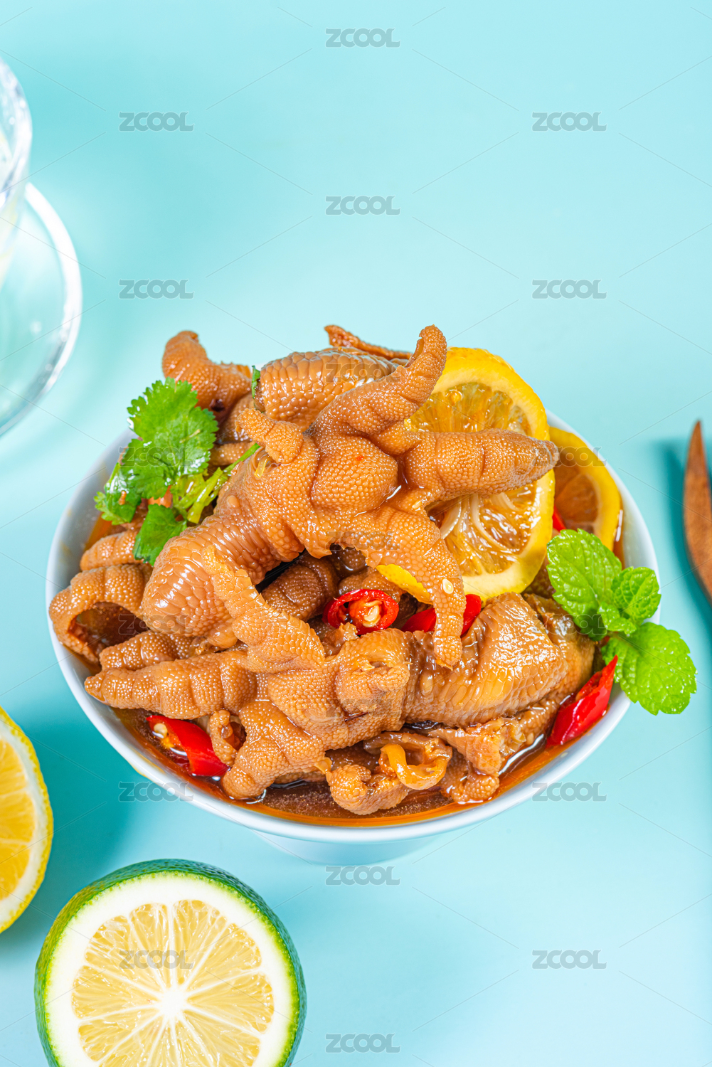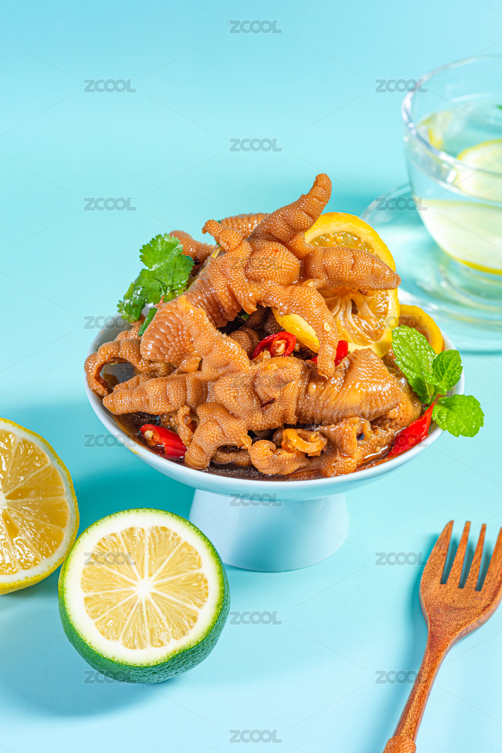 藍(lán)色清新背景上的一盤檸檬酸辣鳳爪