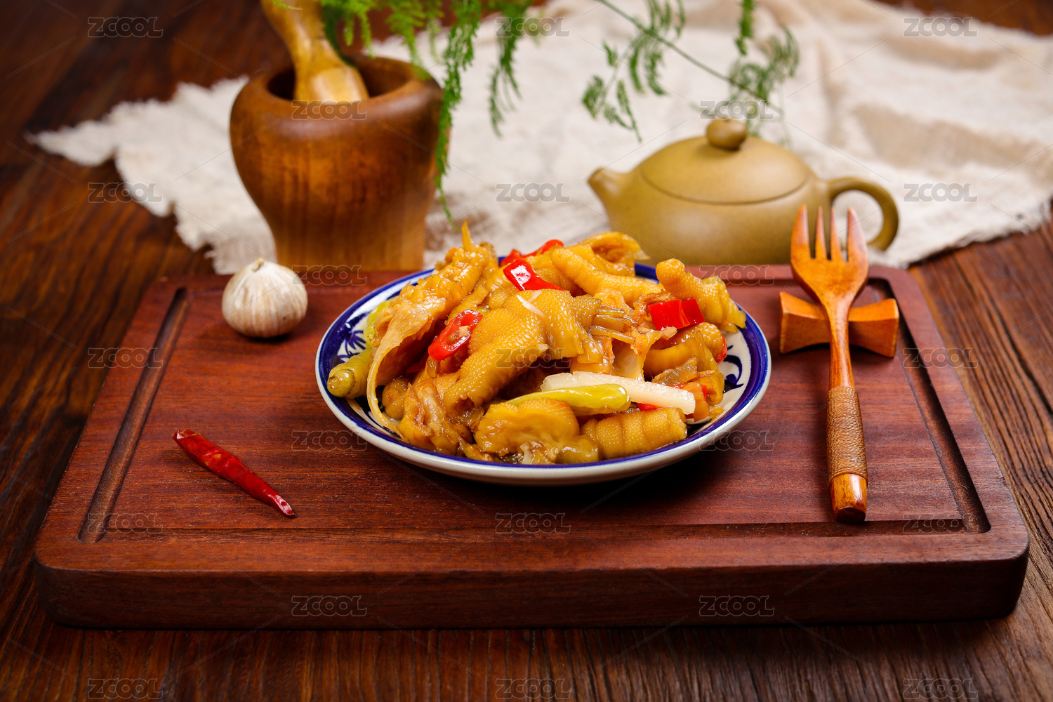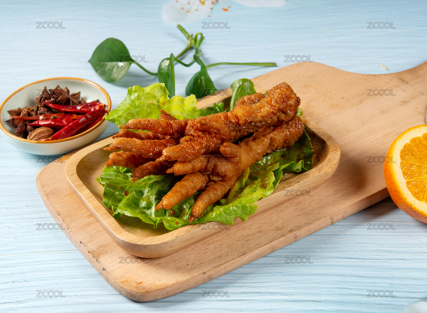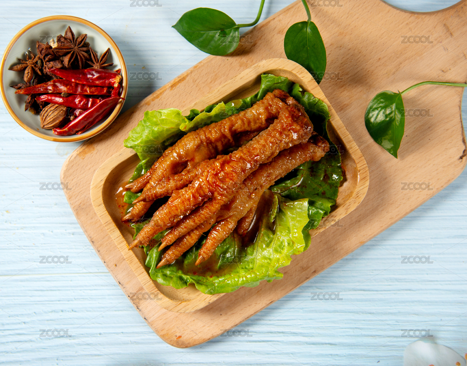 藍(lán)色背景下木質(zhì)砧板上的風(fēng)味小食鹵味醬香雞爪