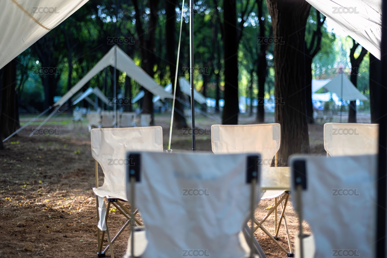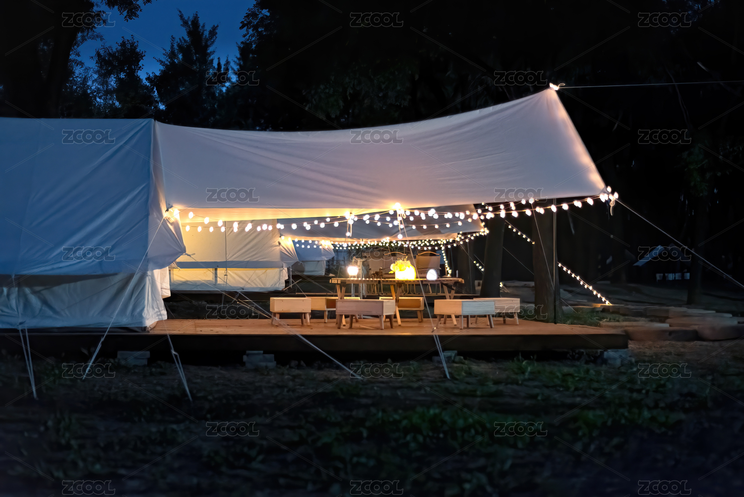 搭著天幕和桌椅的戶外奢侈露營營地