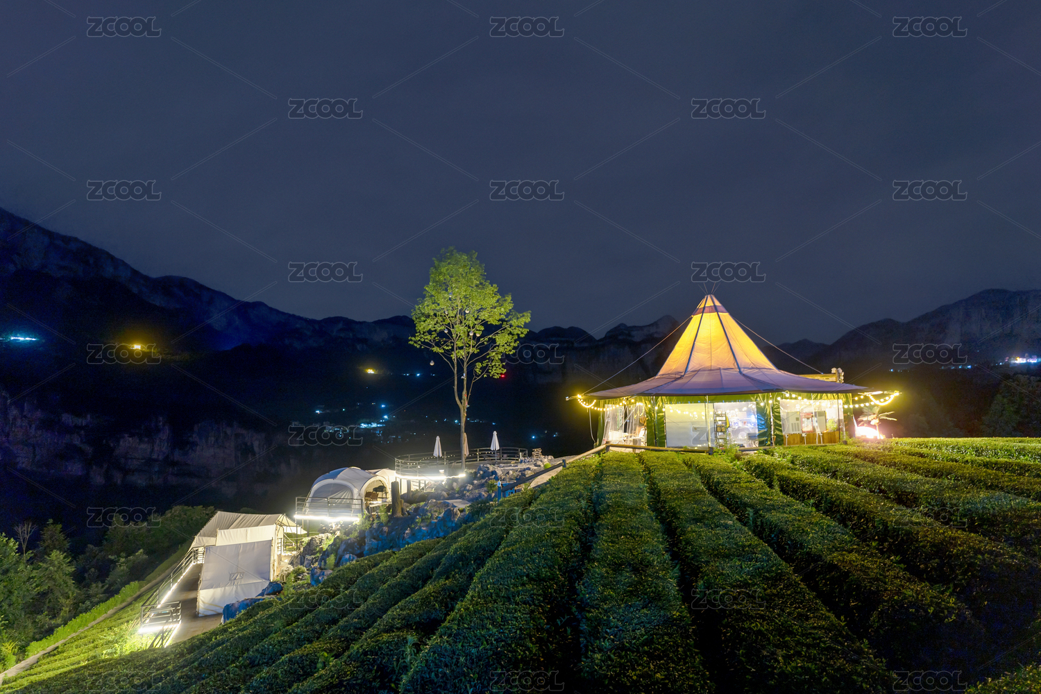 帳篷露營(yíng)地茶園遠(yuǎn)山夏季夜晚燈光璀璨