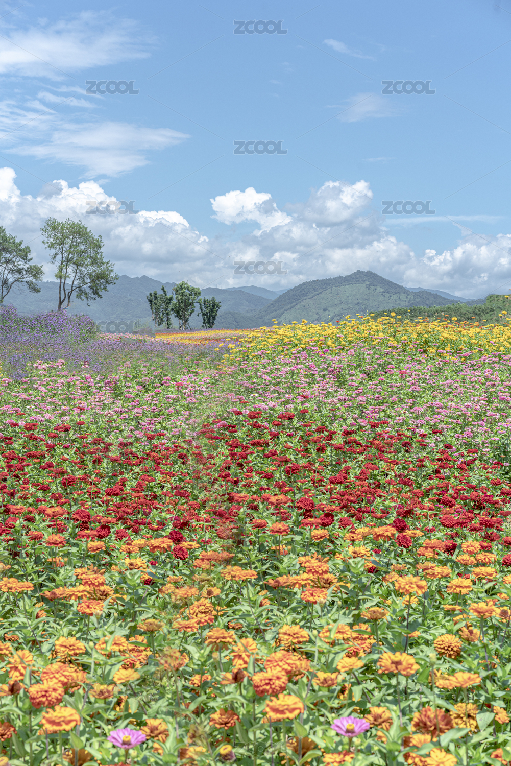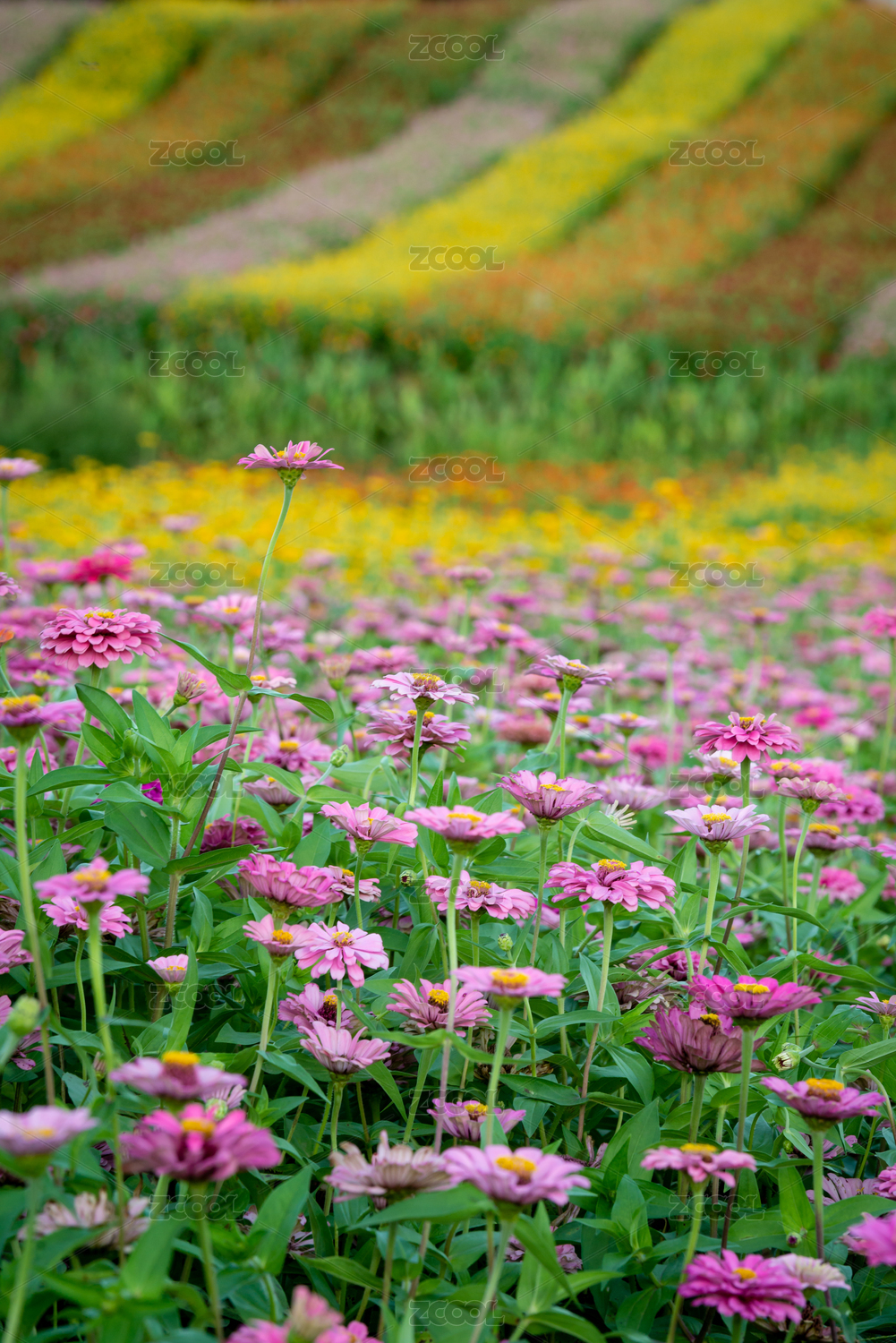 紫紅色百日草和遠(yuǎn)處條塊分割的花海,中國福建龍巖