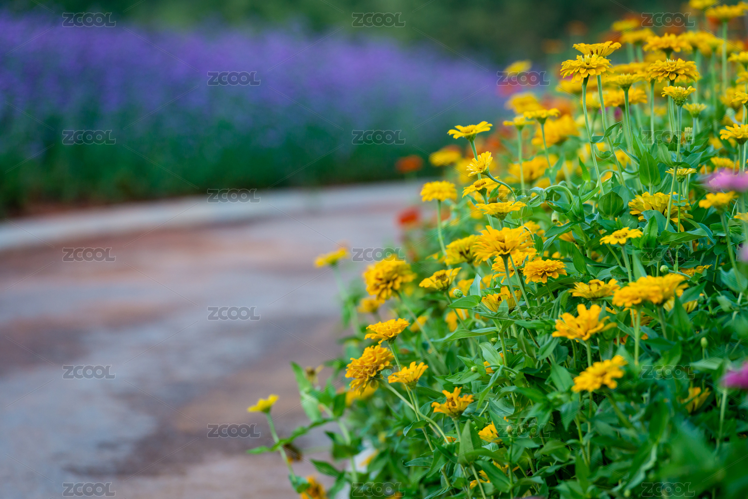 一條小路兩邊分布著紫色的馬鞭馬和黃色的百日草,中國福建龍巖