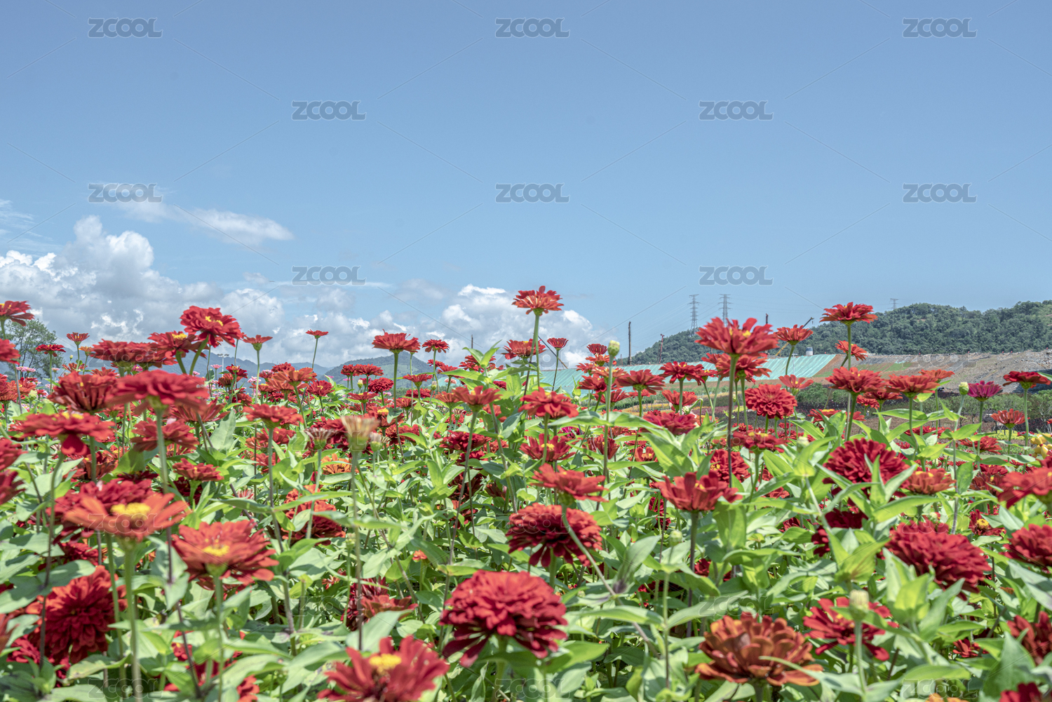 公園里成片的紅色百日草盛開