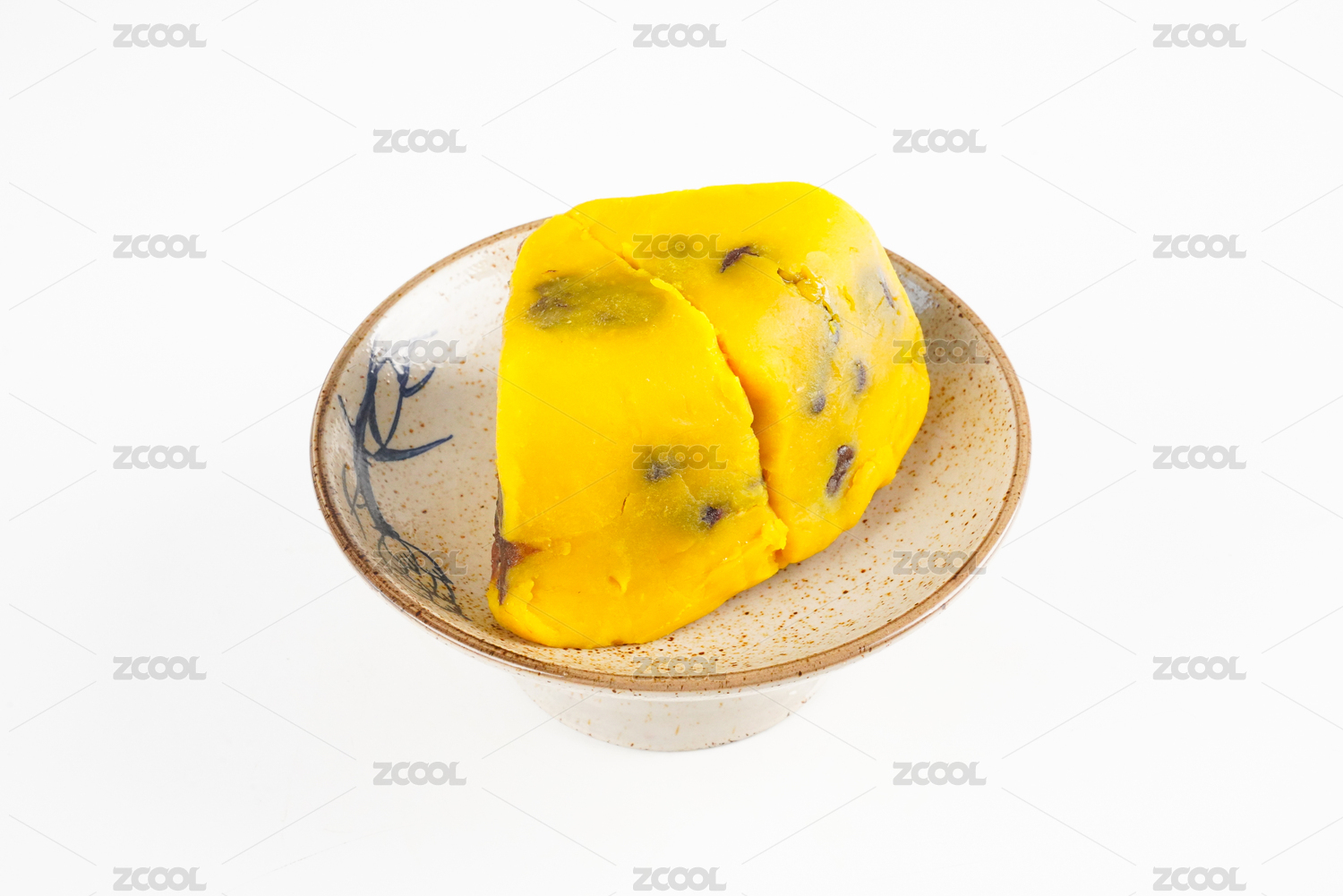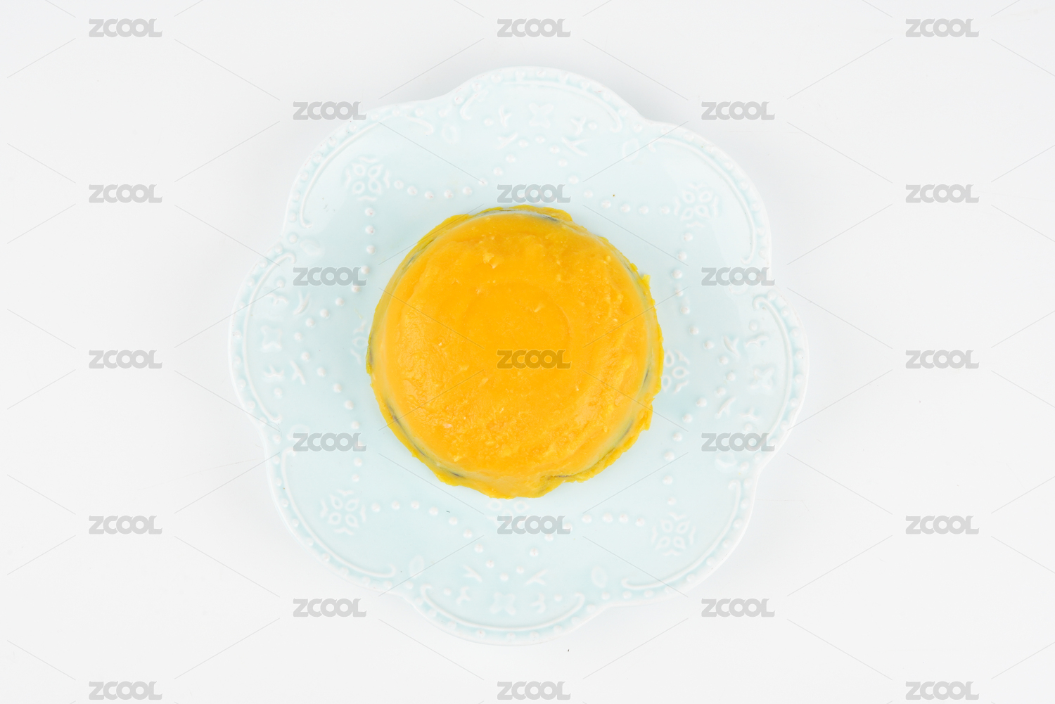 一盤裝著黃色豌豆糕的白色盤子在黑色背景中