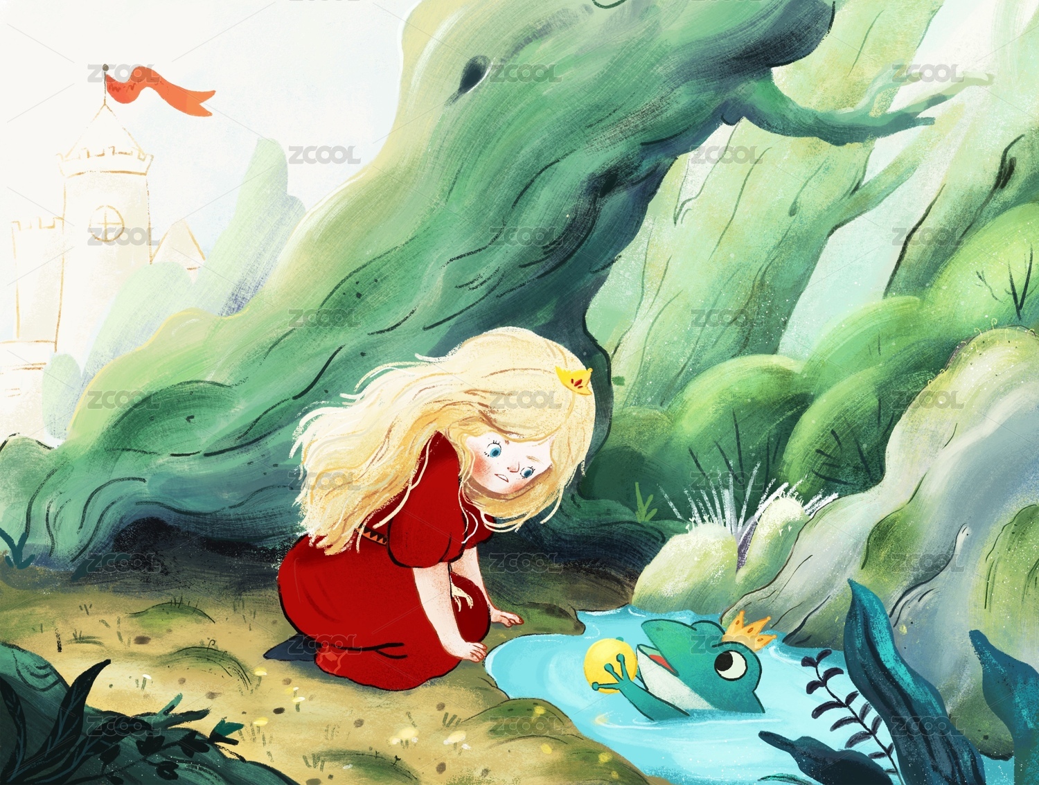 森林旁的小溪里坐在荷葉上的青蛙王子和蝌蚪打招呼