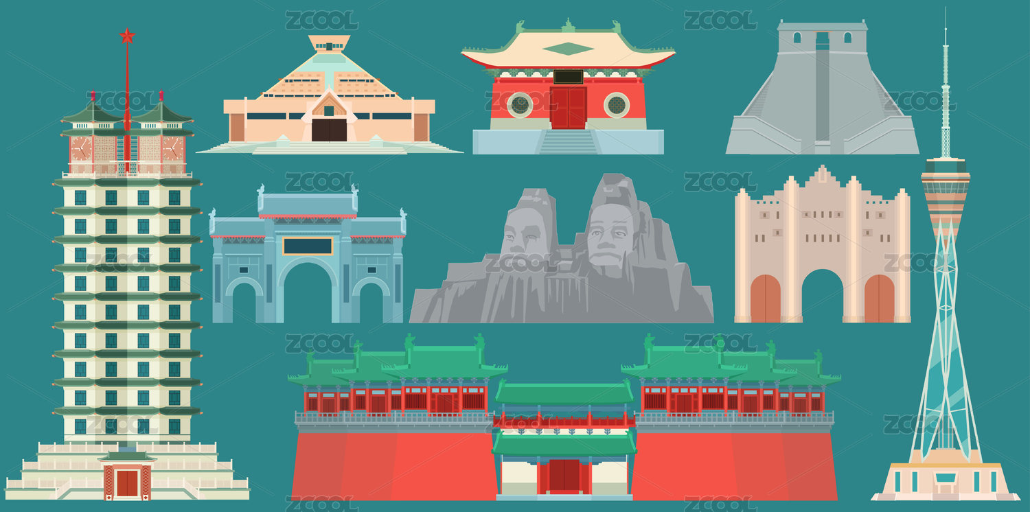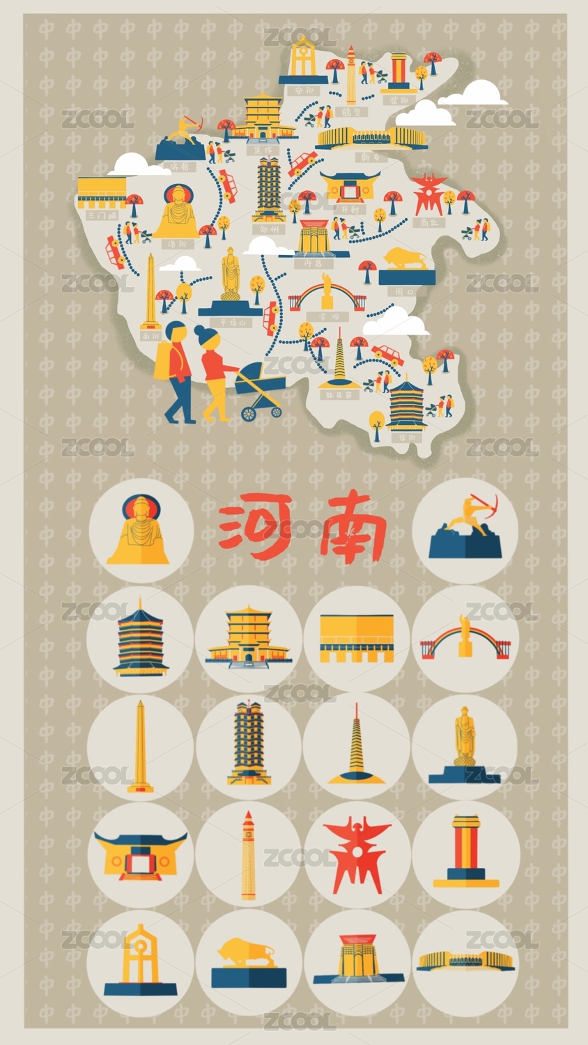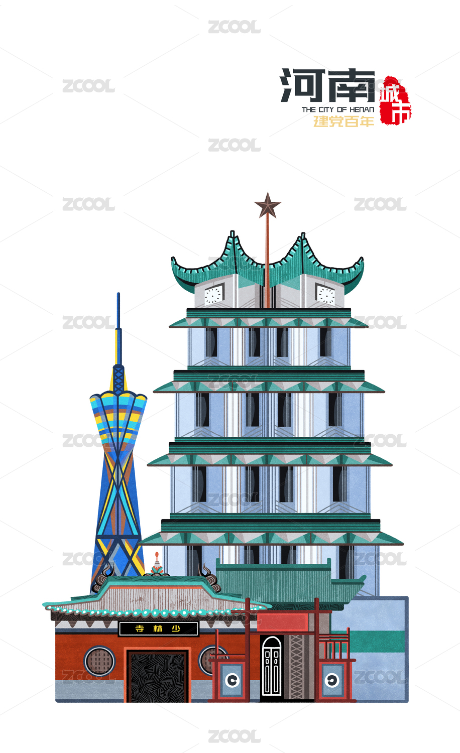 河南省份城市地標群組合原創(chuàng)裝飾建筑插畫