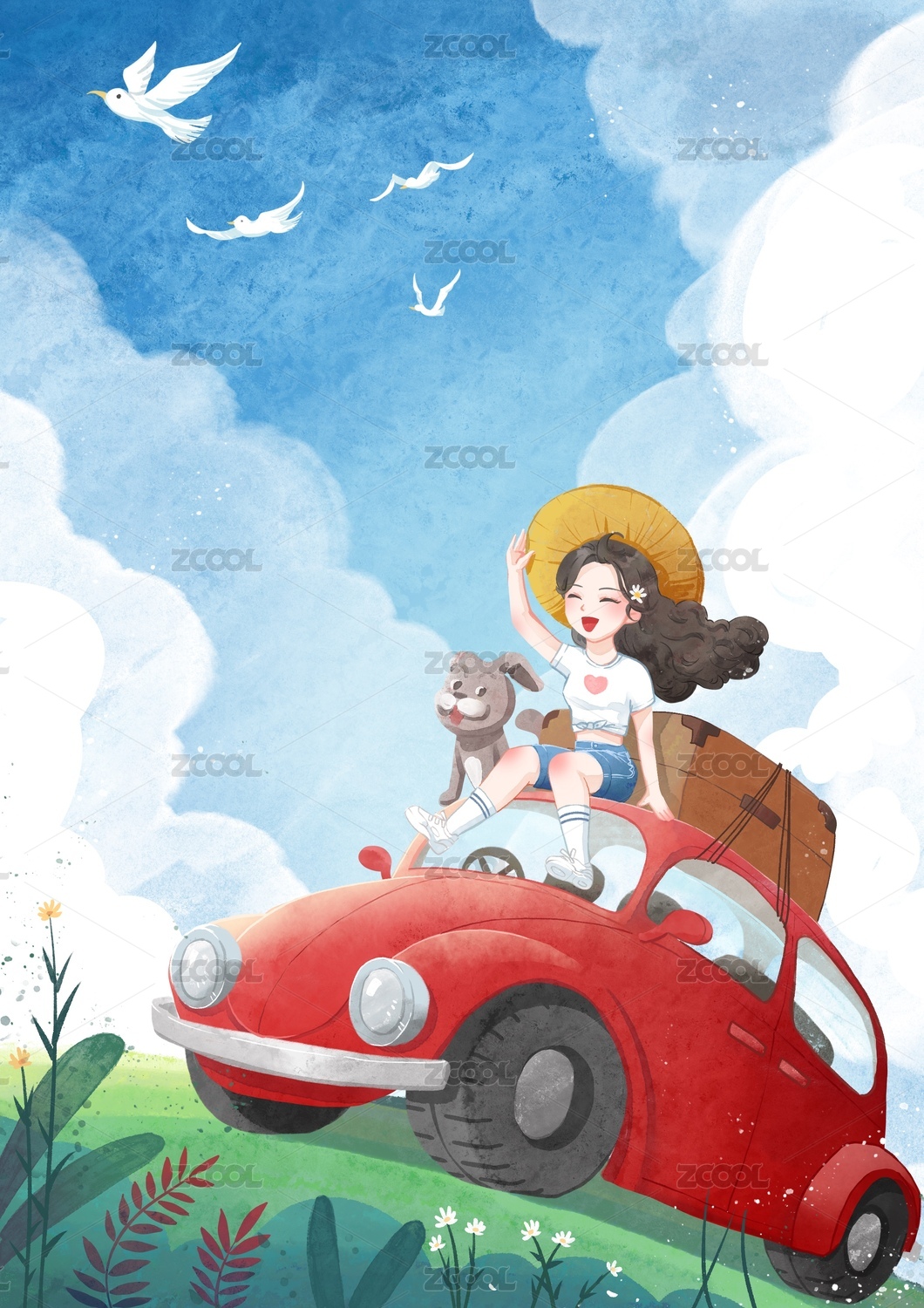 夏天人物畢業(yè)旅行夏至節(jié)氣旅游戶外出行插畫