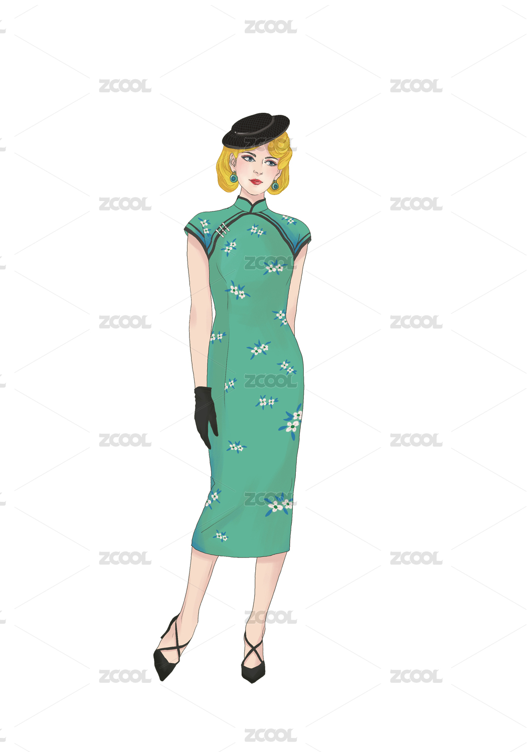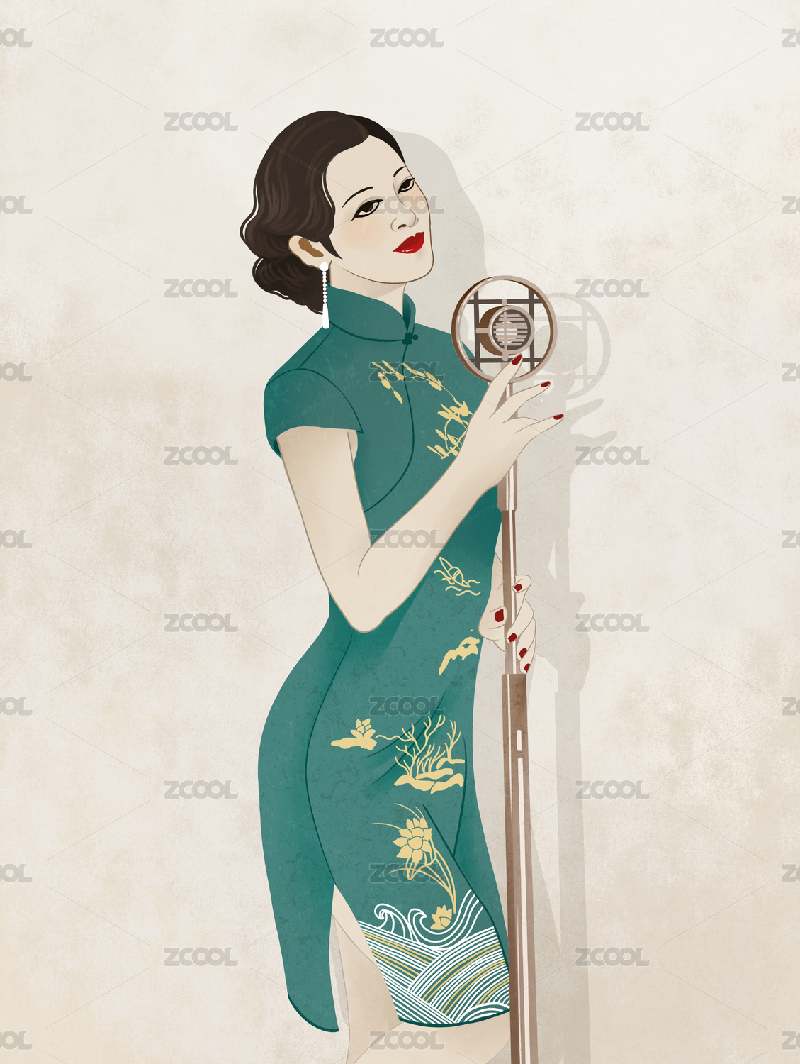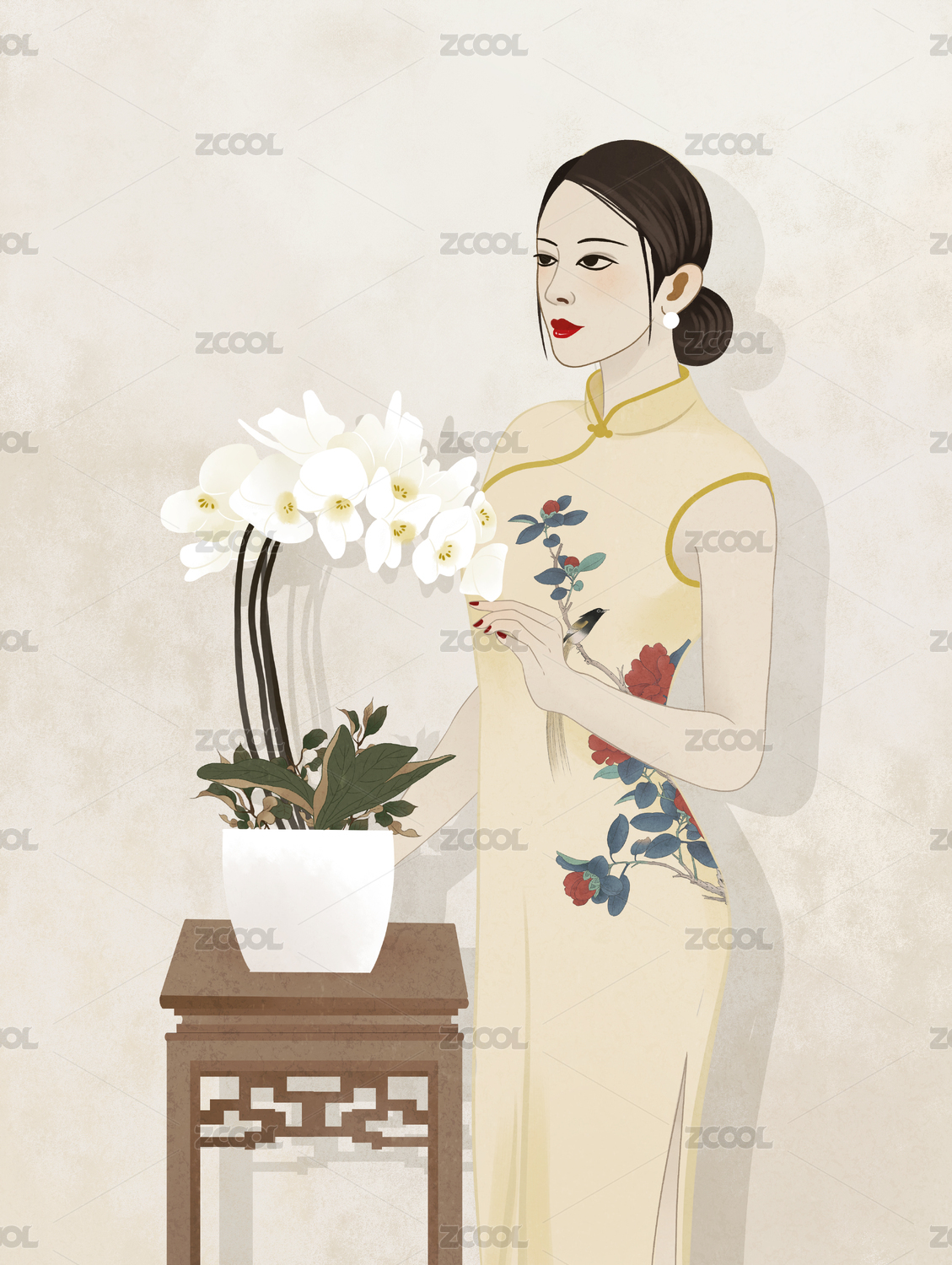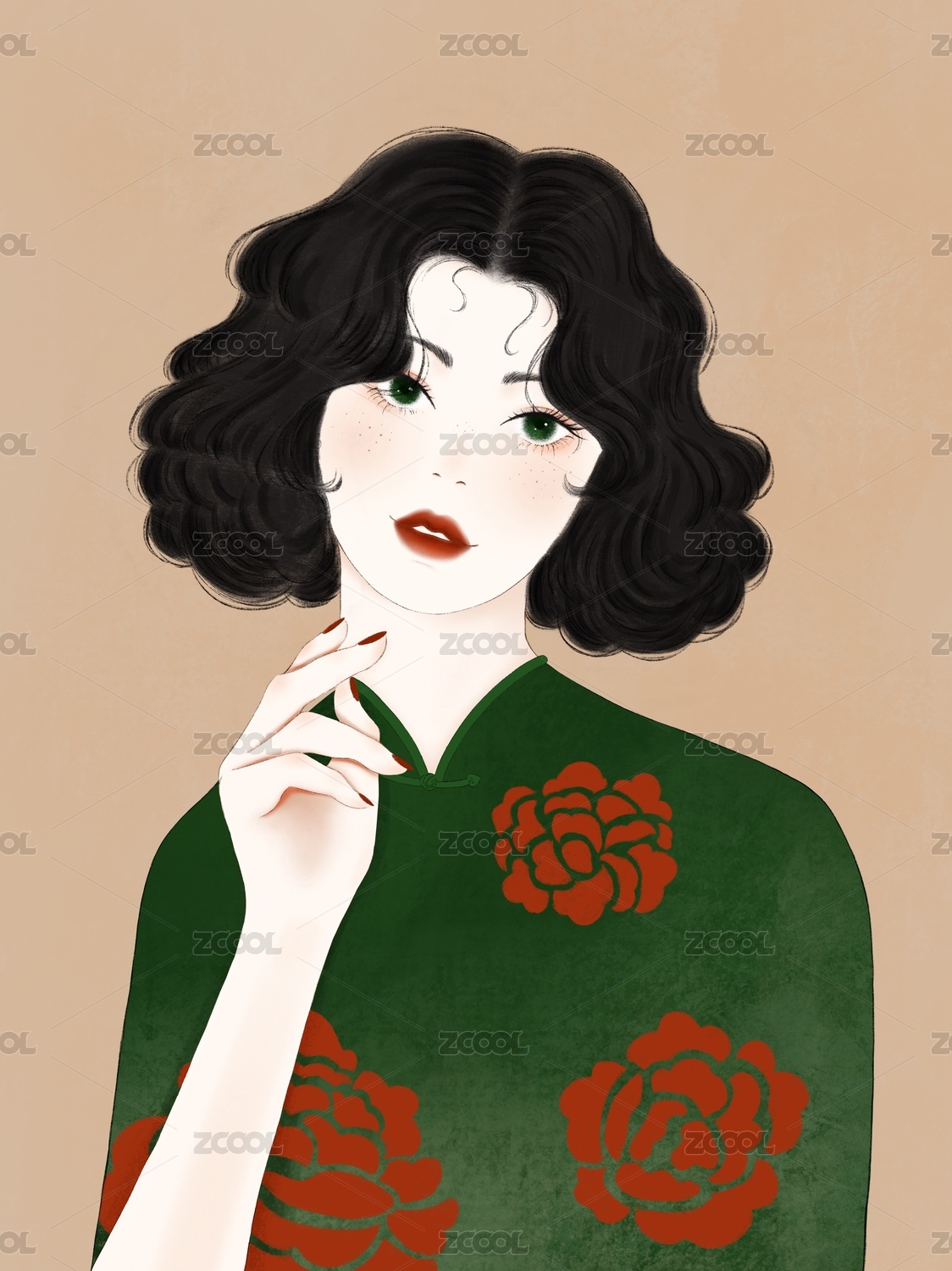 后現(xiàn)代油畫(huà)人物民國(guó)穿旗袍女人服裝雜志封面畫(huà)清新裝飾