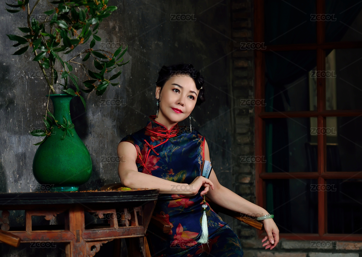 香檳色清新短袖國(guó)風(fēng)波浪卷發(fā)旗袍女人