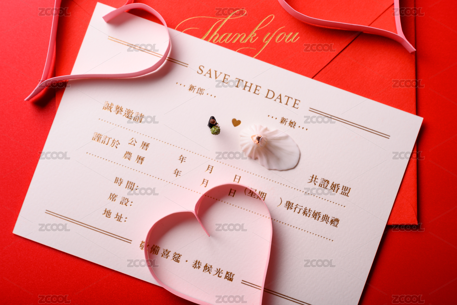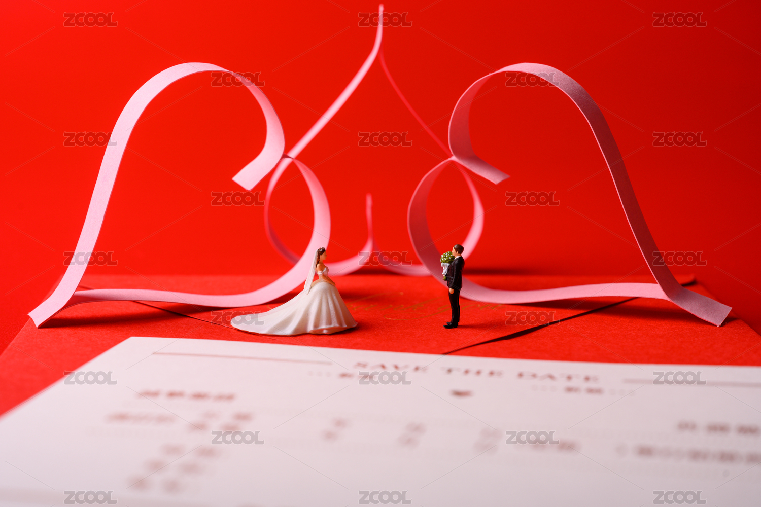 紅色背景上放著的婚禮請柬和微縮景觀婚禮