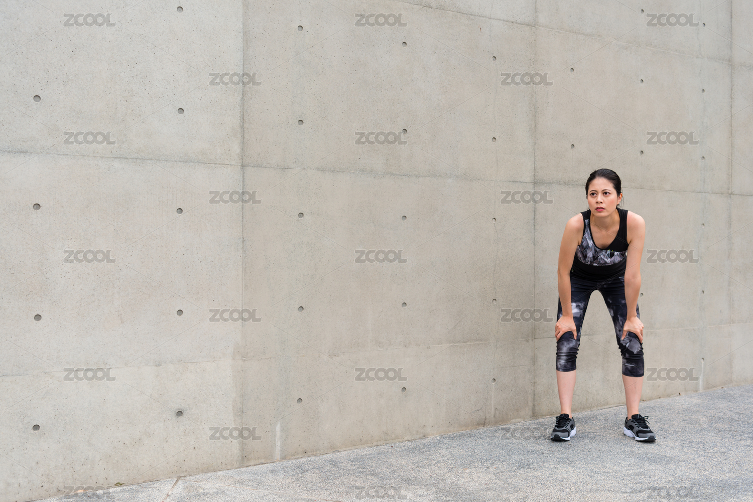 優(yōu)雅的女玩家完整的運(yùn)行耐力在周末假期的自我訓(xùn)練站在灰色背景的戶(hù)外走廊和雙手放在膝蓋上休息。
