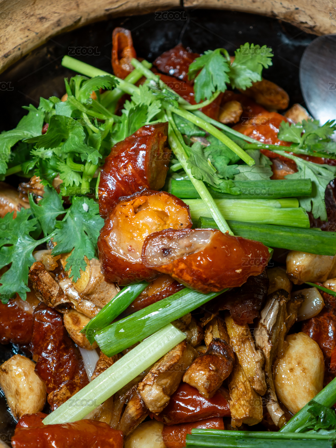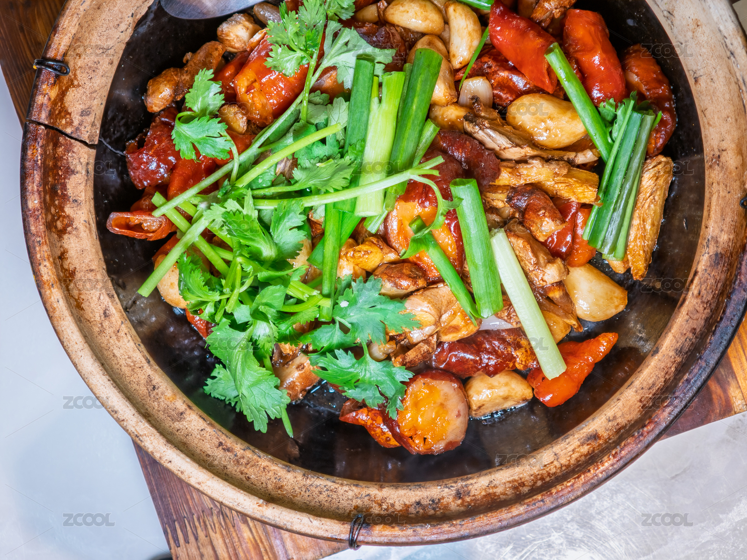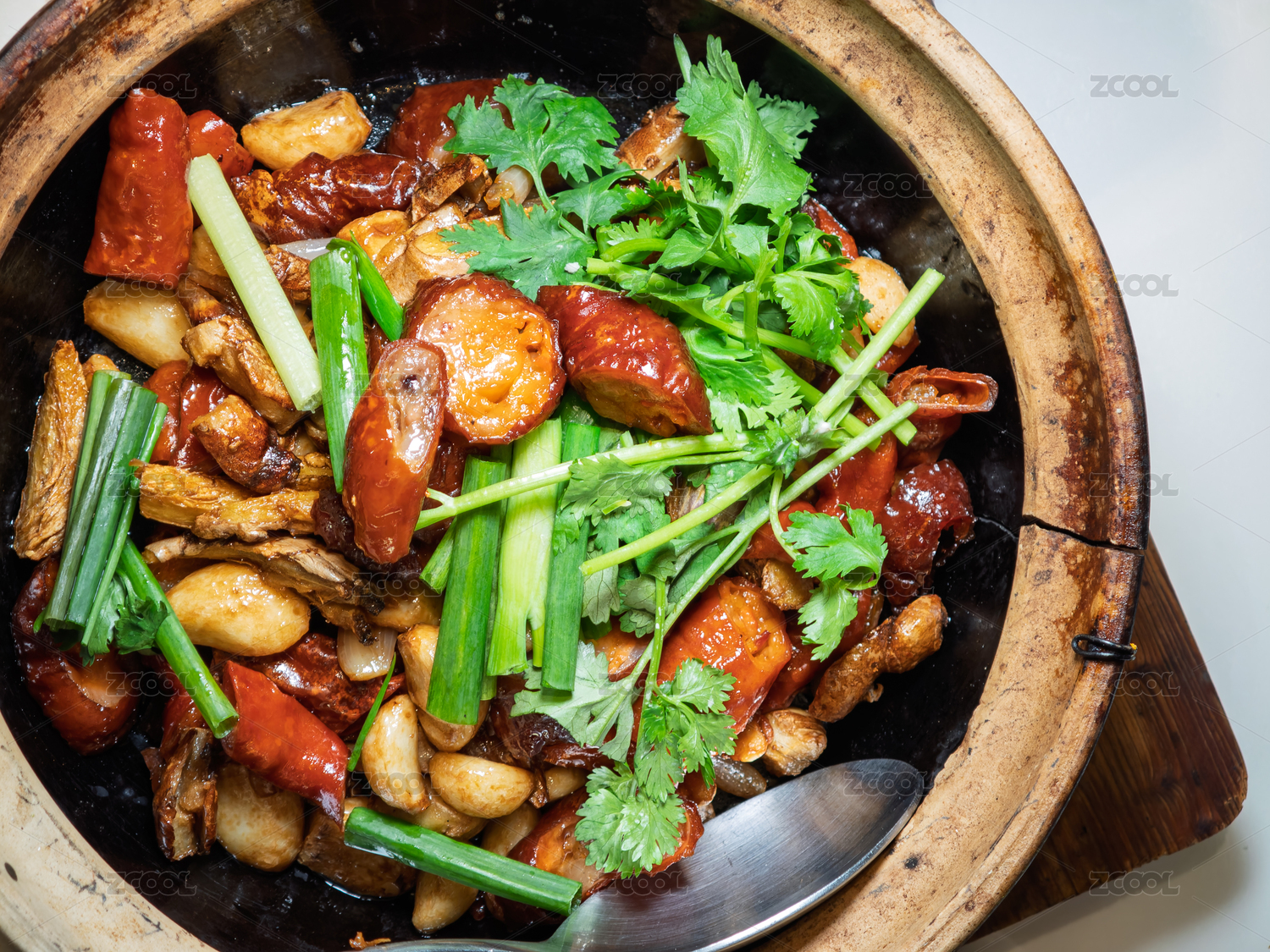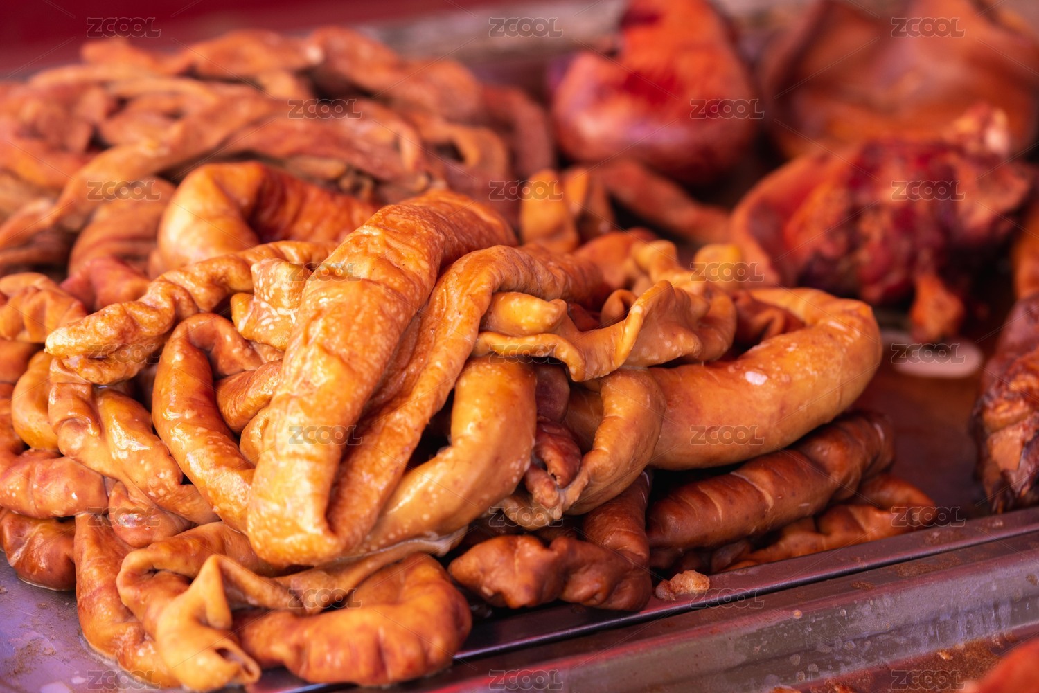 木質(zhì)的菜板子上面放著一堆煙熏臘豬大腸