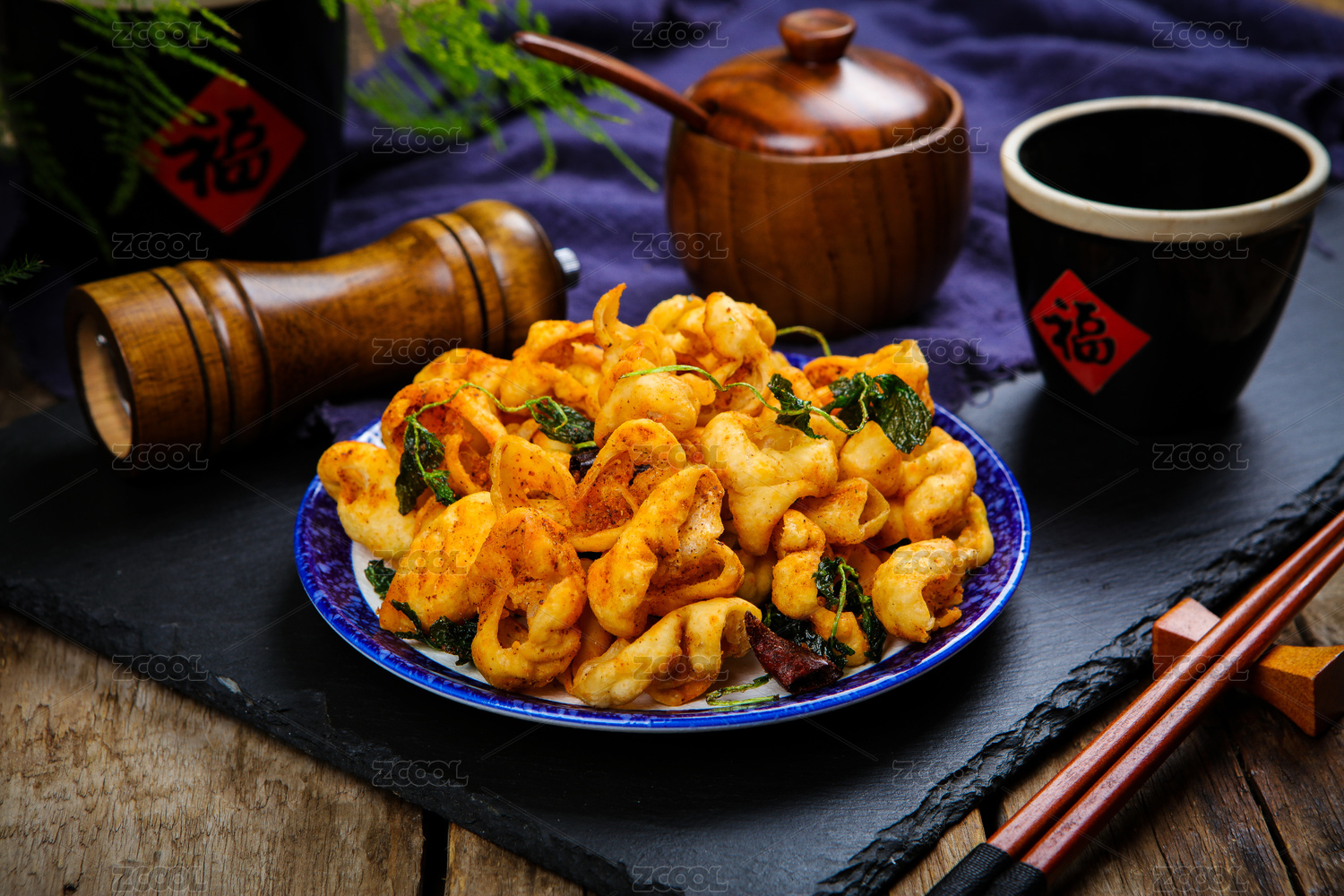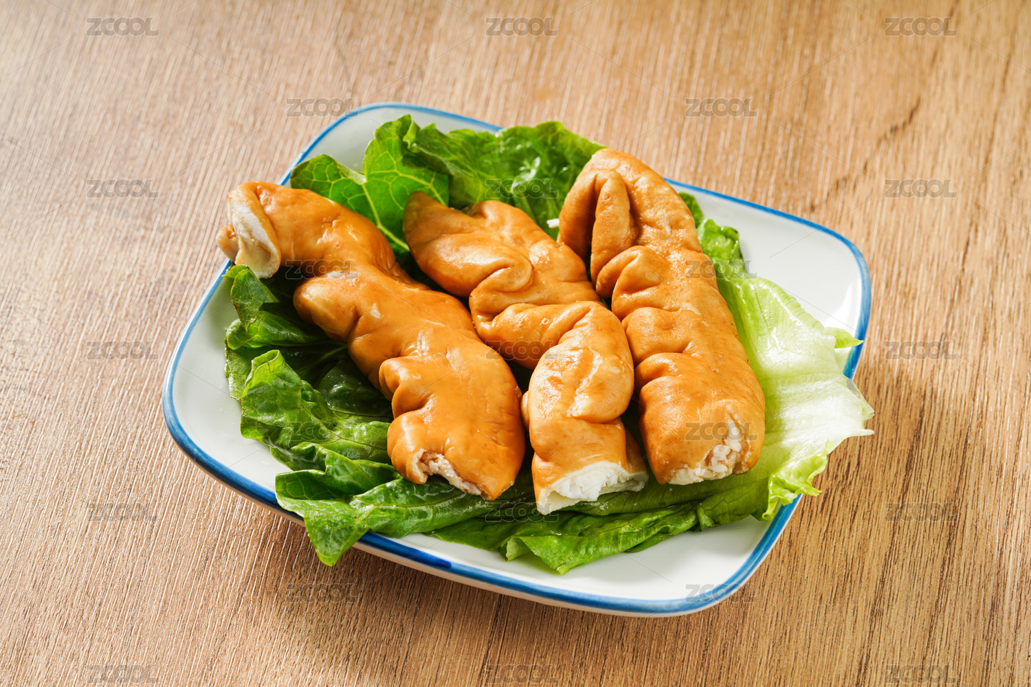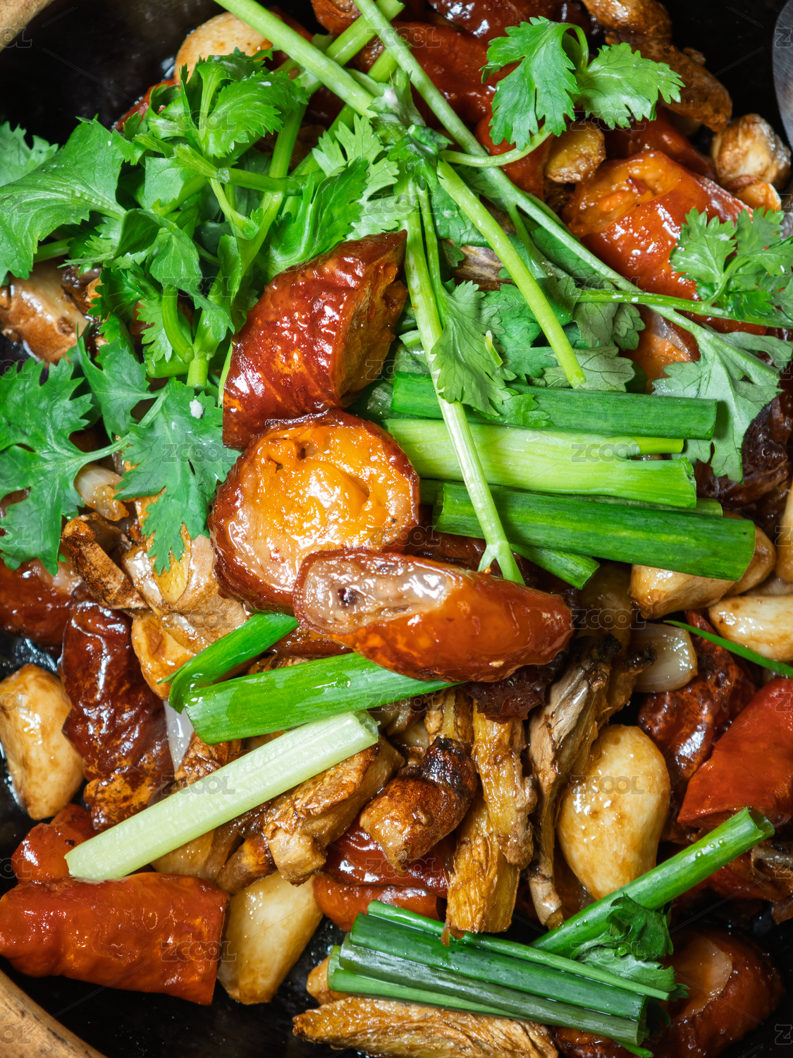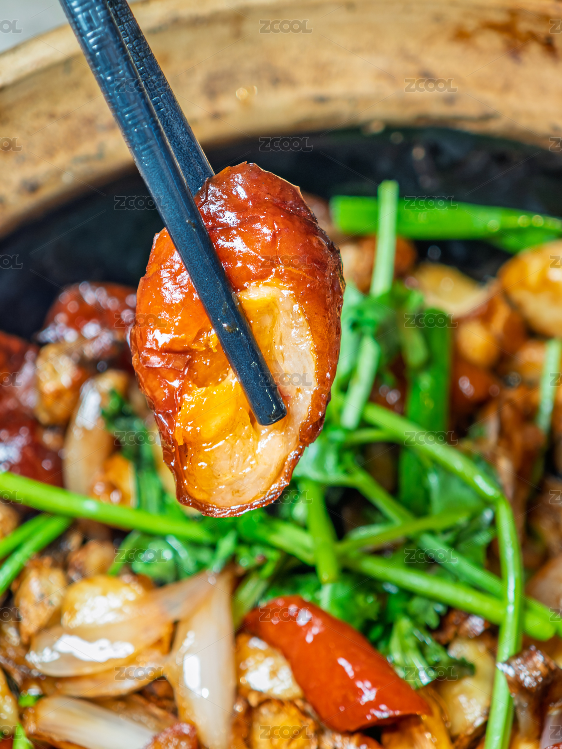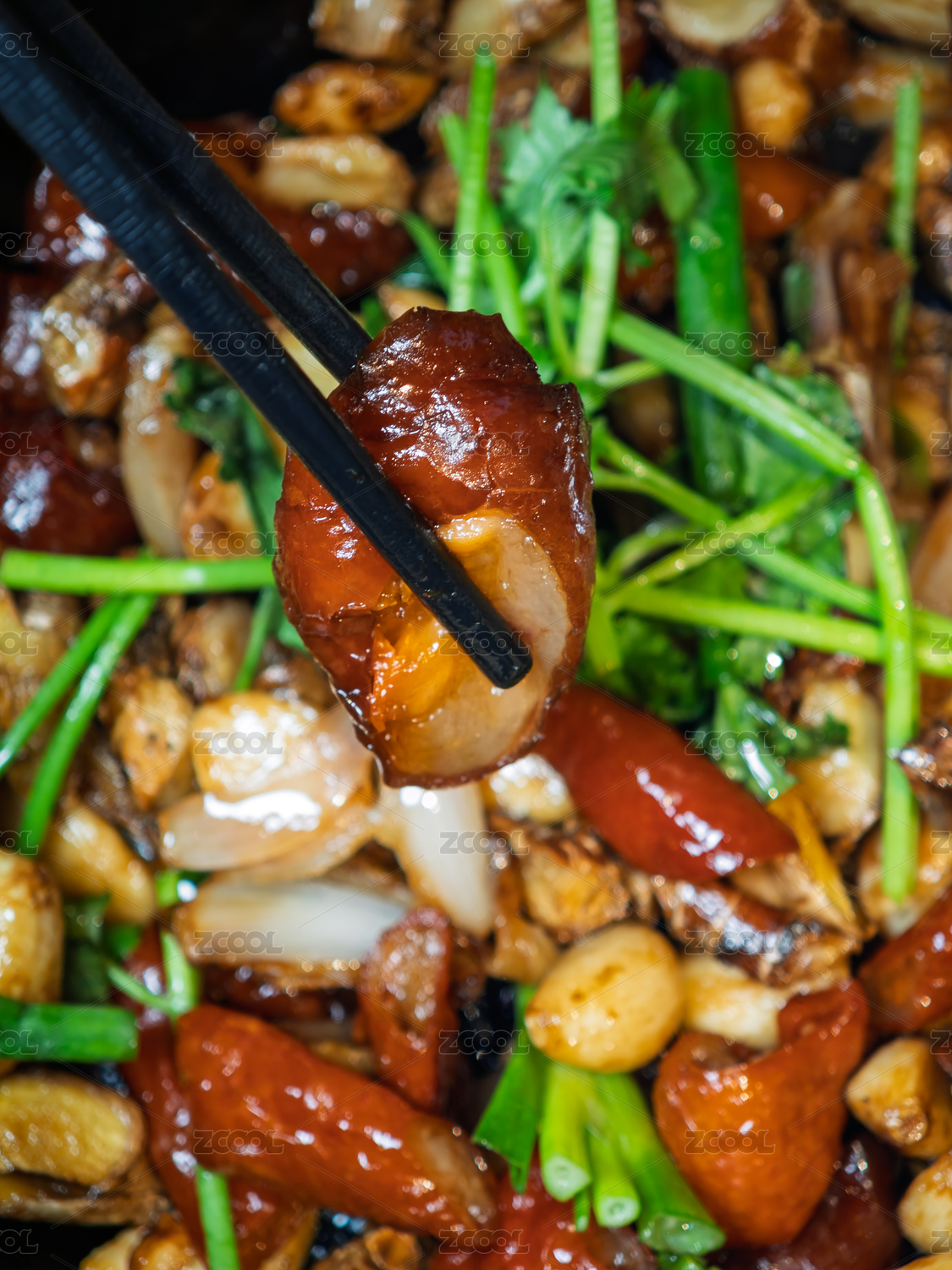 木紋桌面上放著一碗煙熏的臘豬大腸,一雙筷子從夾出來一段,黑色背景