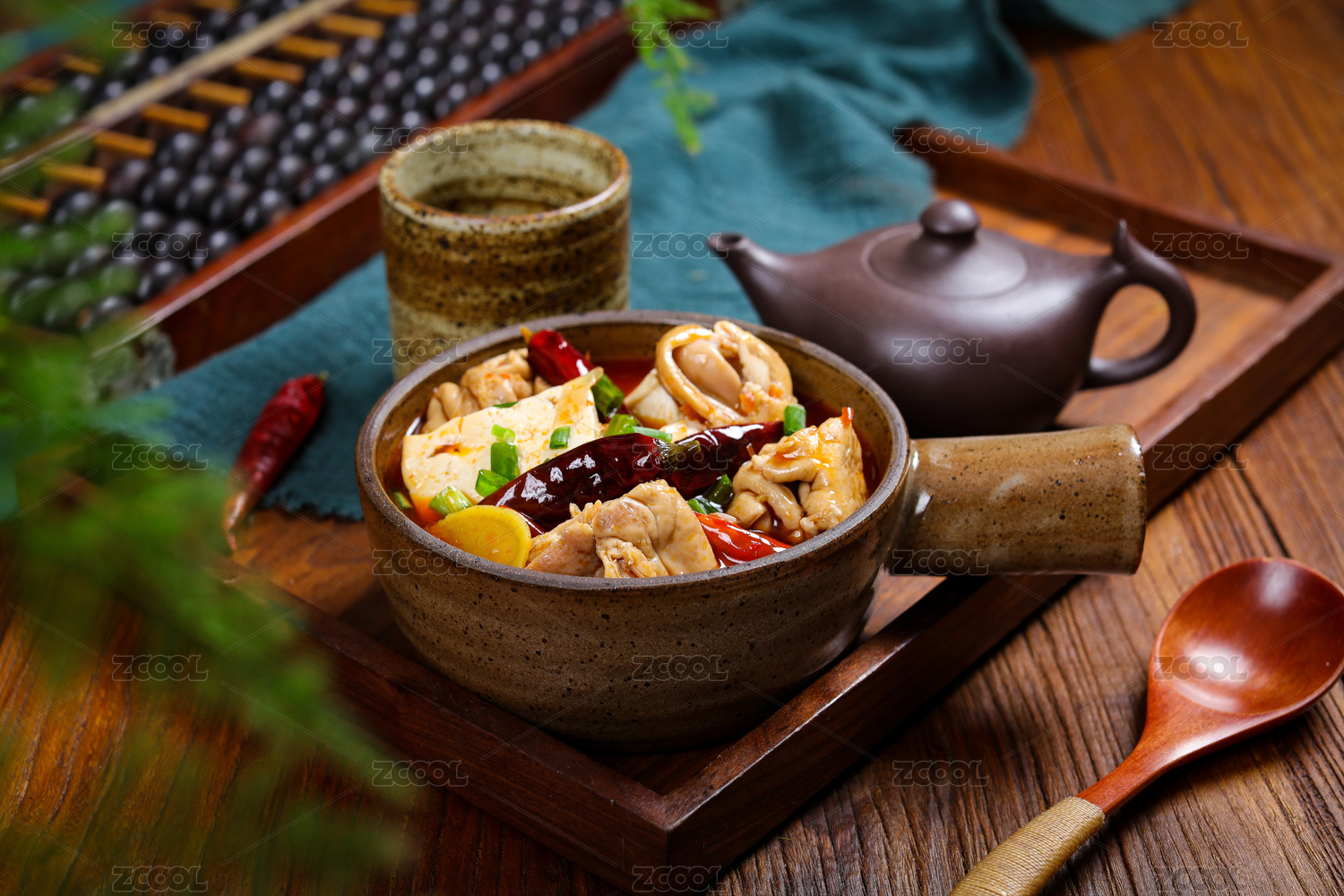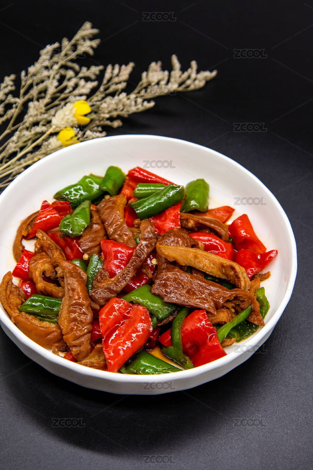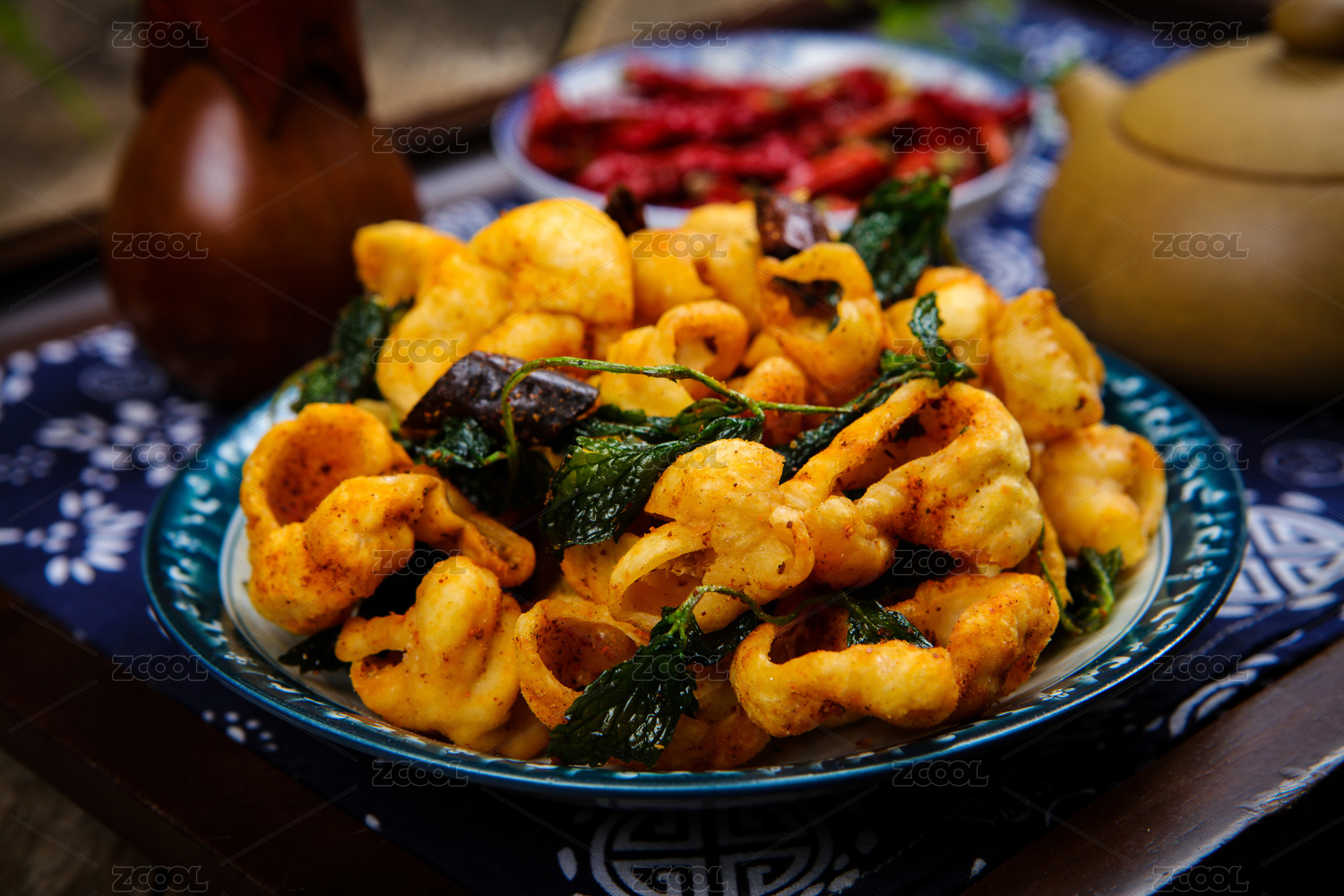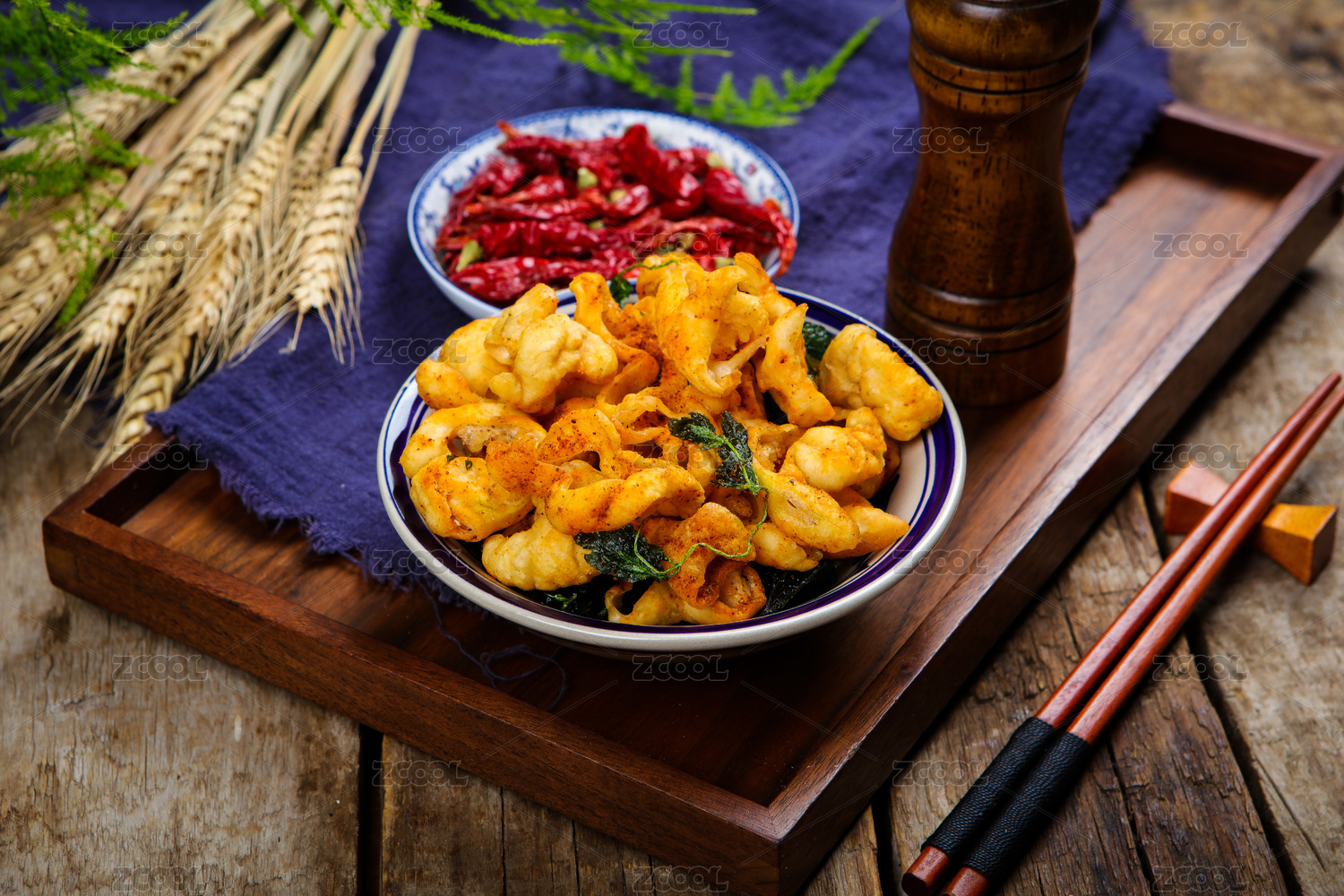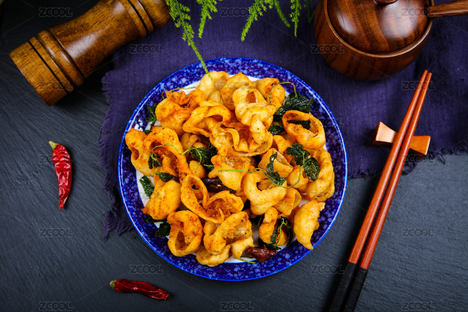 木紋桌面上放著一碗煙熏的臘豬大腸,一雙筷子從夾出來一段,黑色背景