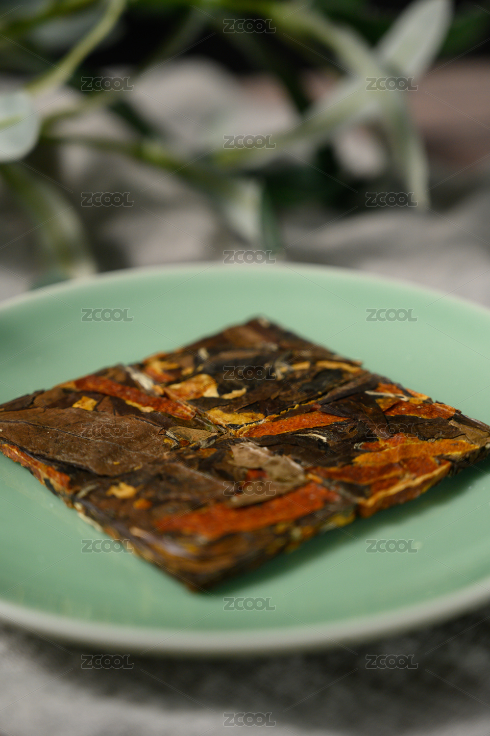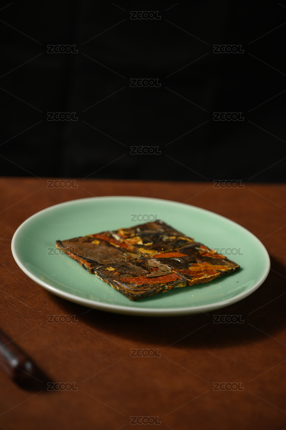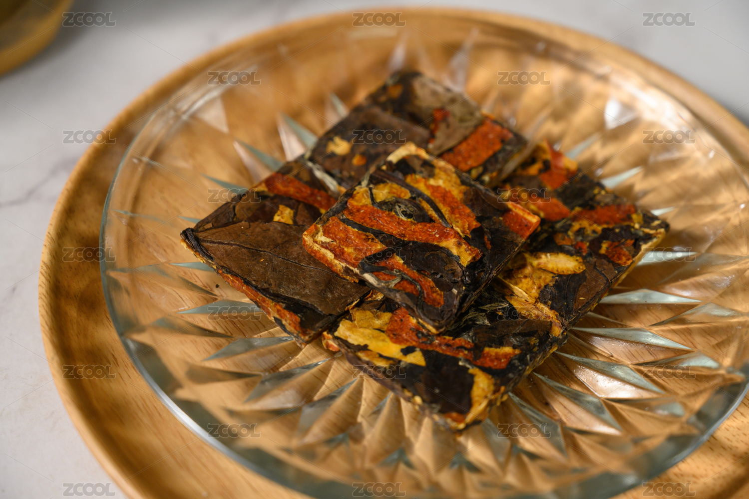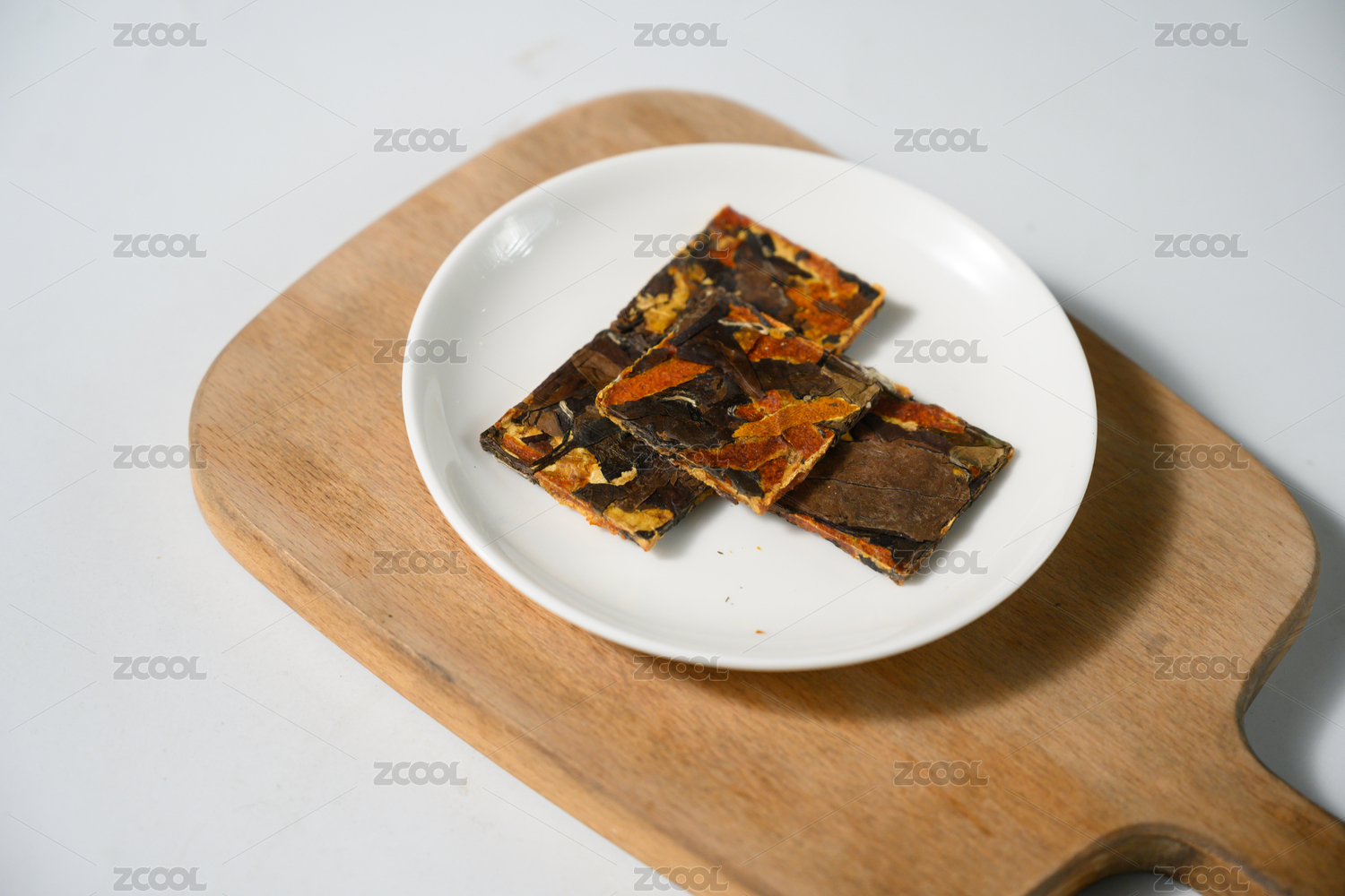 桌面上的盤子里的美味可口的陳皮白茶塊