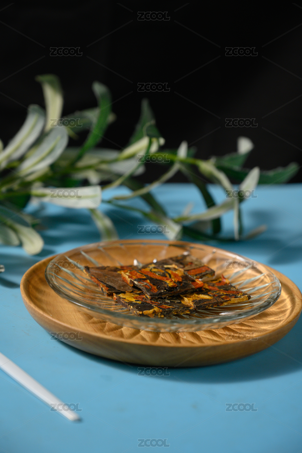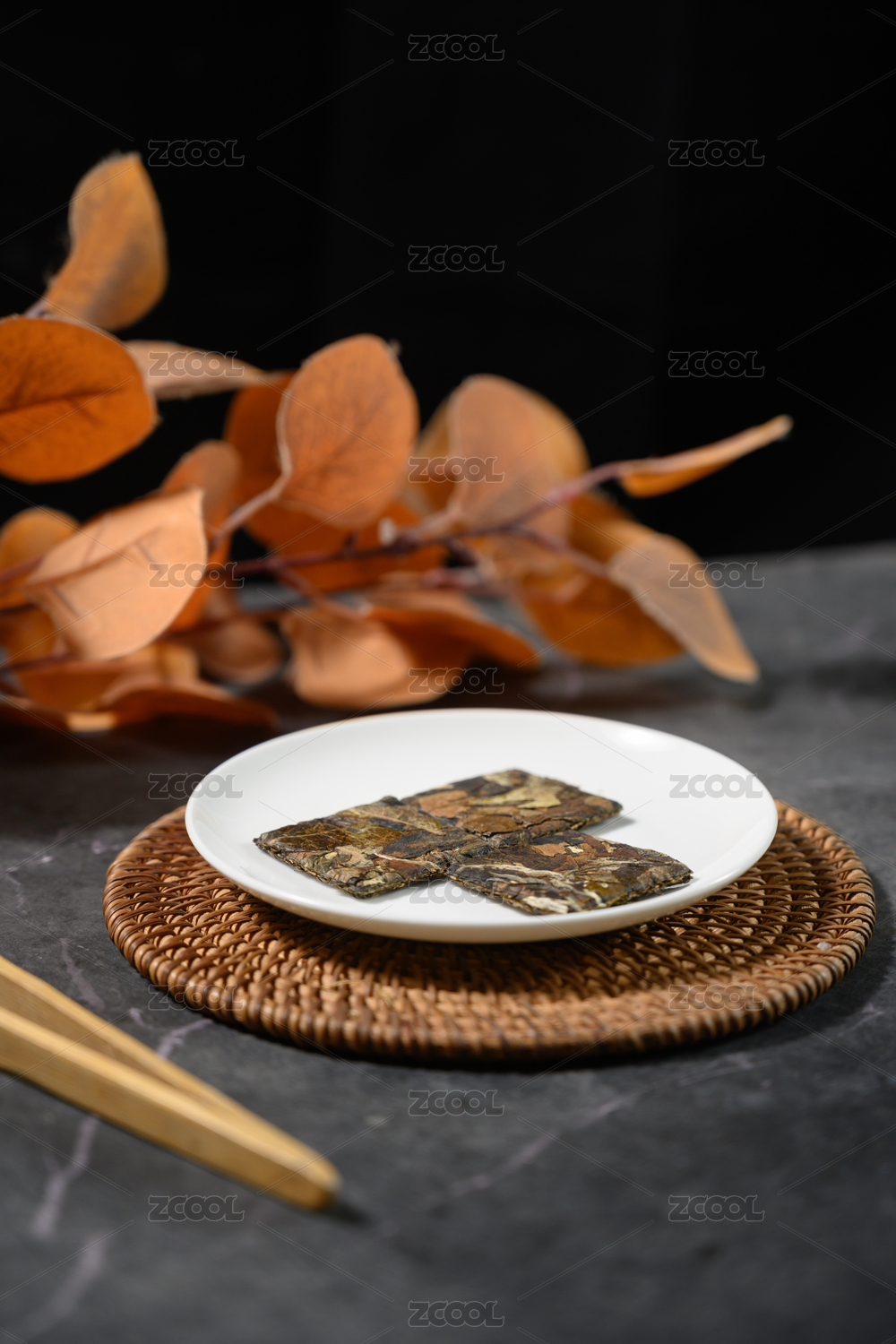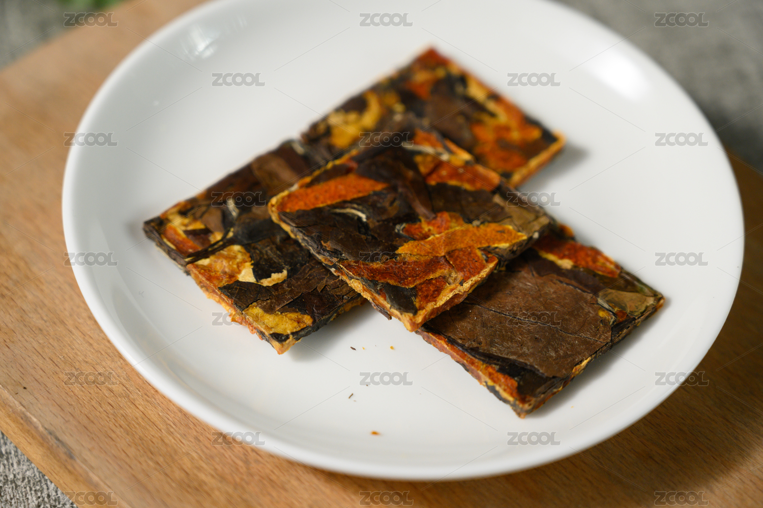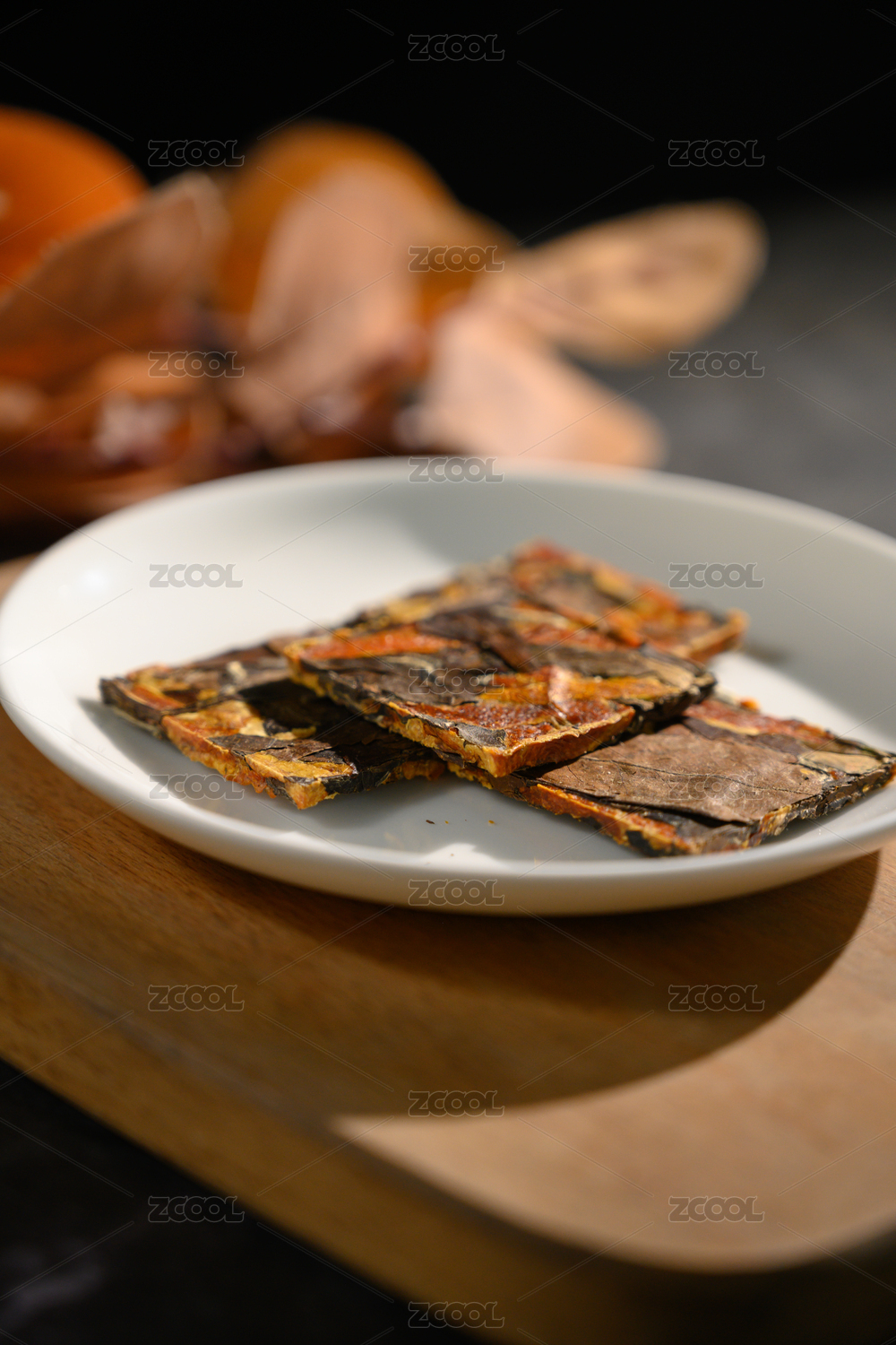 桌面上的盤子里的美味可口的陳皮白茶塊